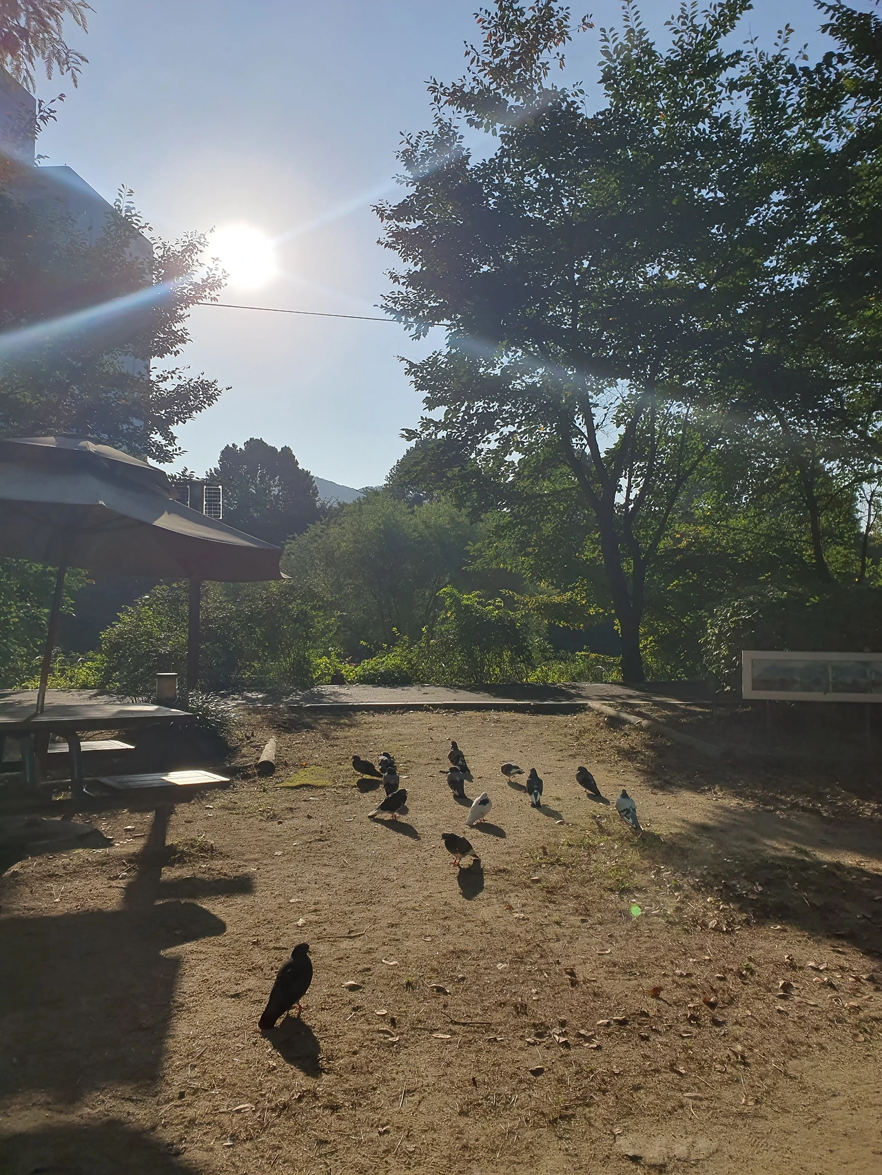 사람이나 새가 동일하게 아침 햇살을 느끼는 것도 신기했고요. 사람이 지나가도 생명의 위협을 느껴서 날아가거나 자리를 옮기지 않는 비둘기 모습을 보면서 제대로된 '도시화(사람과 동화)'되었구나.'라고 느꼈습니다.