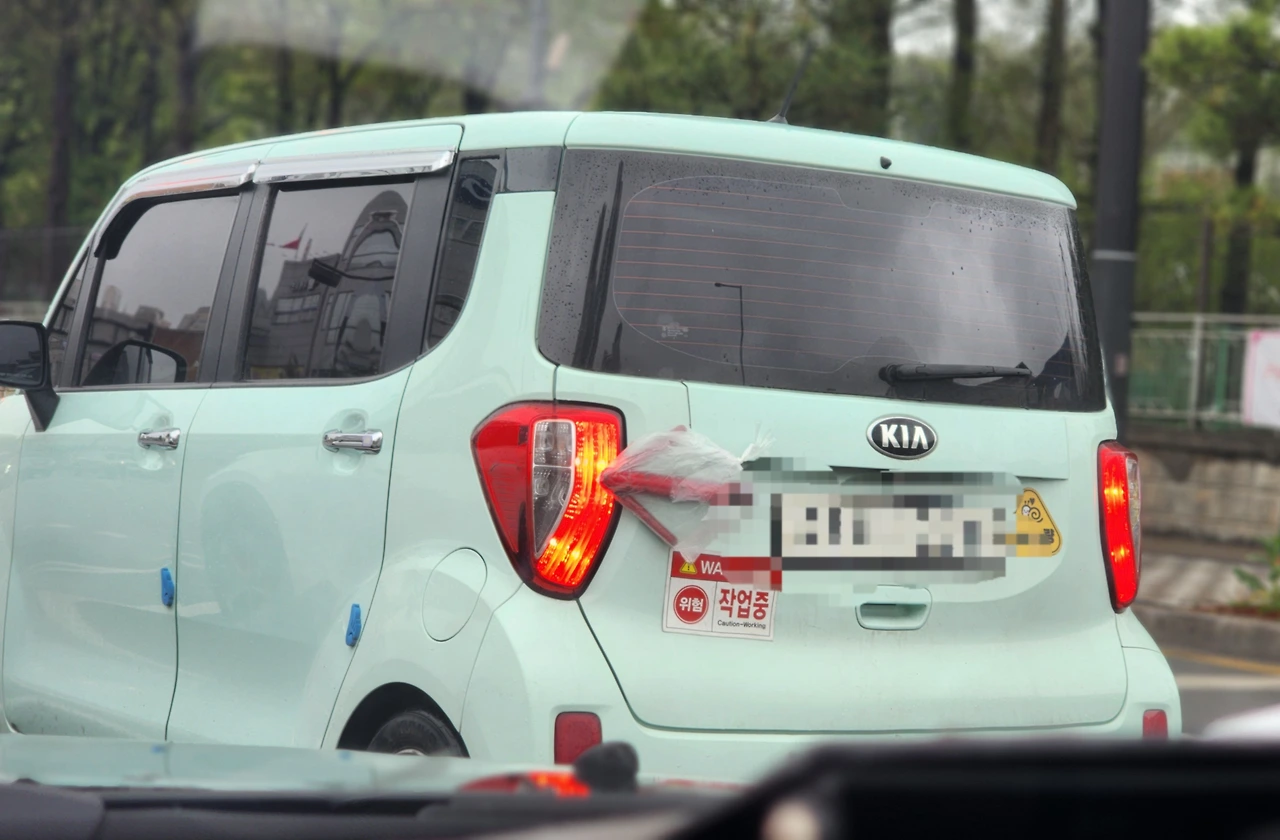 보다가 웃음이 터져 나와서 신호대기하면서 얼른 찍었습니다. 망가진 방향지시등대신 부착한 화살표가 압권이었습니다. 사용하시는 운전자분의 위트가 최고였습니다. 실제로 좌회전 때 깜빡깜빡하길래 웃었습니다. 심지어 우천을 대비해서 일회용 봉지로 우비처럼 감싸놓으셨습니다.