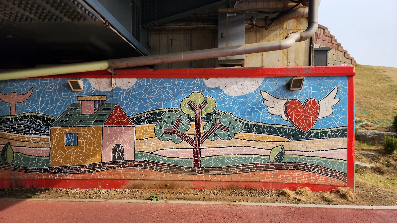 수변공원을 걷다가 다리아래 모자이크벽화를 보게 되었습니다. 깨어진 조각들을 색깔 맞춰서 붙여놓으니까 멀리서 보면 아름다운 그림이 됩니다.