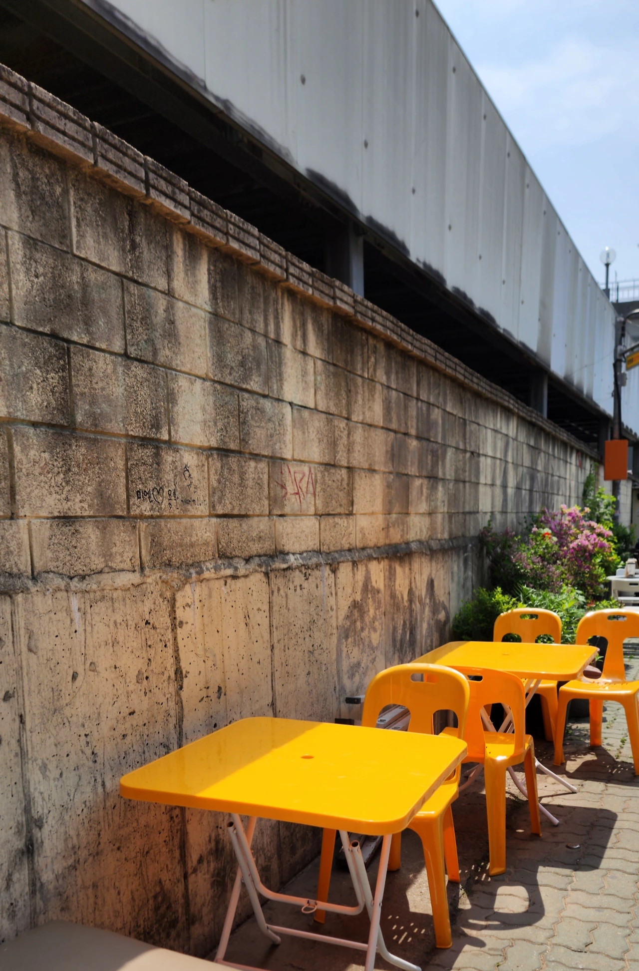 한편으로는 동남아가 생각났습니다. 현지 길거리에서 볼 수 있는 오래되고 거친 시멘트 벽, 바닥과 심한 이질감을 느낄 만큼 알록달록한 테이블과 의자들이 떠올랐습니다.