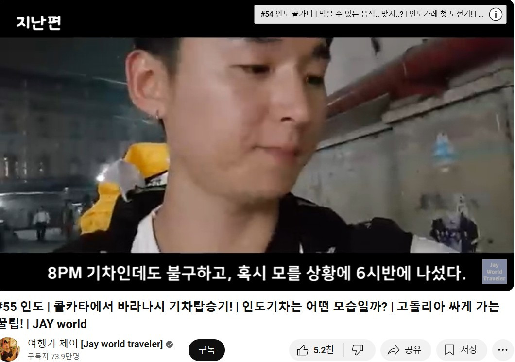 2. 여행가 제이, - 점잖은 1인 여행, 물을 보면 늘 수영을 즐기는 것을 보면서 아이들과 자유분방함을 소원하게 한 영상임. 이 영상을 보면서 아이들이 힘들고 속상하지만 여행은 역시 '맛'이 있다고 함. 인도 영상을 보고 나서 꼭 가보고 싶다고 했음.