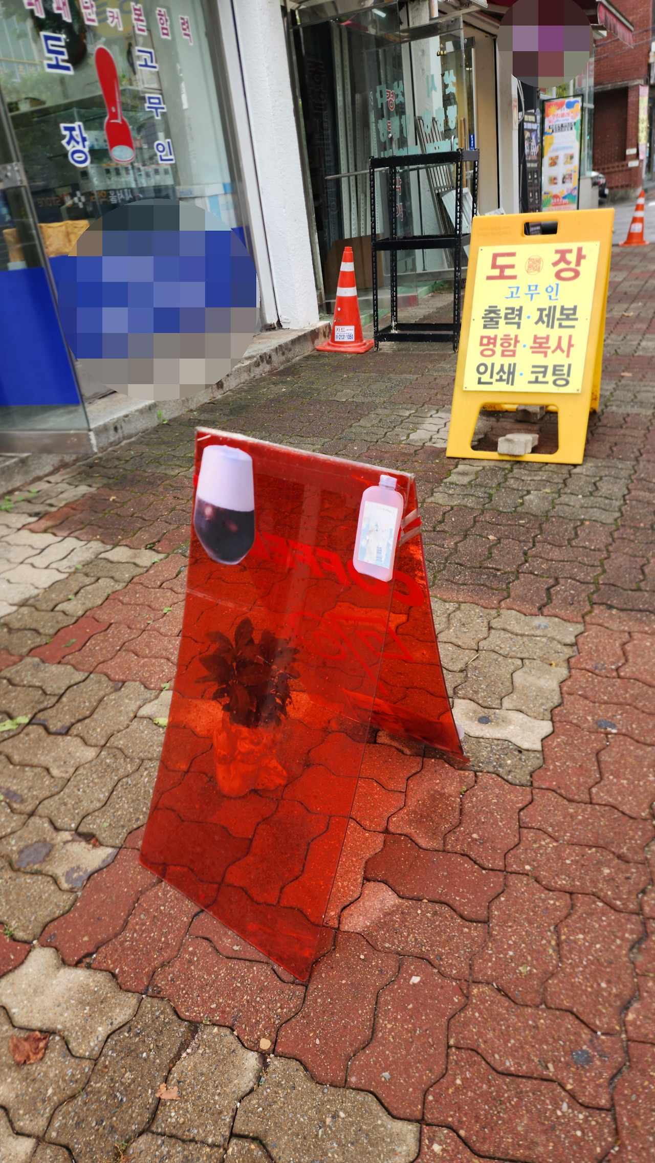 입간판이지만 안내하고 싶은 것 말고 저 안에 보호하고 있는 화분이 다 들여다보이는 게 좋아 보인다.