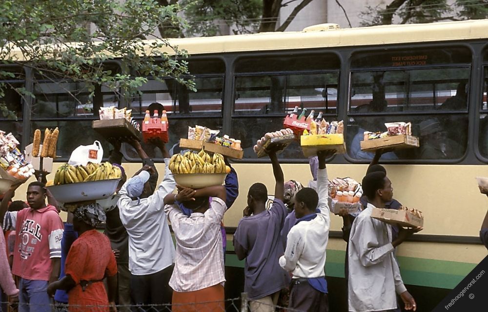 버스가 잠시 조그마한 마을에 정차할 때면, 열린 창문으로 뜬금없이 노르스름한 옥수수가 들어왔다. 길거리에서 옥수수를 팔던 상인이 긴 막대에 옥수수를 꽂아 버스 창문 안으로 불쑥 집어넣는다. 창문 넘어 옥수수를 들이밀고 있는 그를 바라보면 활짝 웃는다. 내 또래나 되었을까. 당황스럽기도 하고, 웃기기도 해서 옥수수를 사 먹는다. 짭쪼름한 옥수수가 맛있긴 하다. 앞에 있는 다른 창문들을 보면 다들 옥수수니 바나나니 하는 것들이 창문을 통해 들어와 있다. 아프리카에서만 볼 수 있는 풍경이 아닐까.