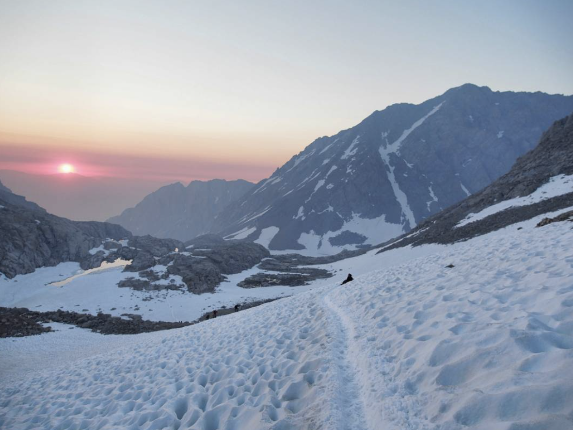 푹푹 빠지는 설산을 장시간 걷는 건 지치는 일이었다. 조금이라도 방심하면 금방 미끄러지고 넘어졌다. 그에 따른 체력 소모도 장난이 아니었다. 눈 앞에 펼쳐진 길은 쓰레기로 뒤덮인 것 같았다. 마치 군인들이 눈을 보면 하늘에서 떨어지는 쓰레기라고 하듯, 내 눈 앞에도 하늘에서 버려진 쓰레기들이 앞을 가로막는 느낌이었다. 사진으로 볼 때야 그저 아름답고 저 공간에 머물고 싶은 마음이 가득하겠지만 그날의 기록을 찾아보니 역시나 욕으로 가득 차있다. 끝나지 않는 눈과의 싸움은 언제까지 계속될런지. 제발 맨바닥을 밟으며 걷고 싶다. 미끄러지지 않고 싶다. 똑바로만 걸을 수 있었으면 좋겠다. 발이 그만 젖었으면 좋겠다. 엉덩방아도 그만 찧었으면 좋겠다. 엉덩이가 그만 젖고 싶다. 지겹다. 지겹다. 지겹다!!!! 눈이 너무 지겹다. 대강 이런 내용에 육두문자가 섞여 있는 내용이었다. 물론 그렇다고 해서 눈의 효용가치가 전혀 없는 것은 아니다. 물이 없을 때 눈을 녹여서 먹을 수 있으니(실제로 그렇게 마시기도 함) 사막에서와 달리 5리터의 물을 들고 다닐 필요가 없다. 또 눈으로 덮인 내리막이 펼쳐진 길에선 매트를 썰매삼아 한번에 빠르게 내려갈 수도 있다. 그래서 엉덩이가 다 젖는 것...