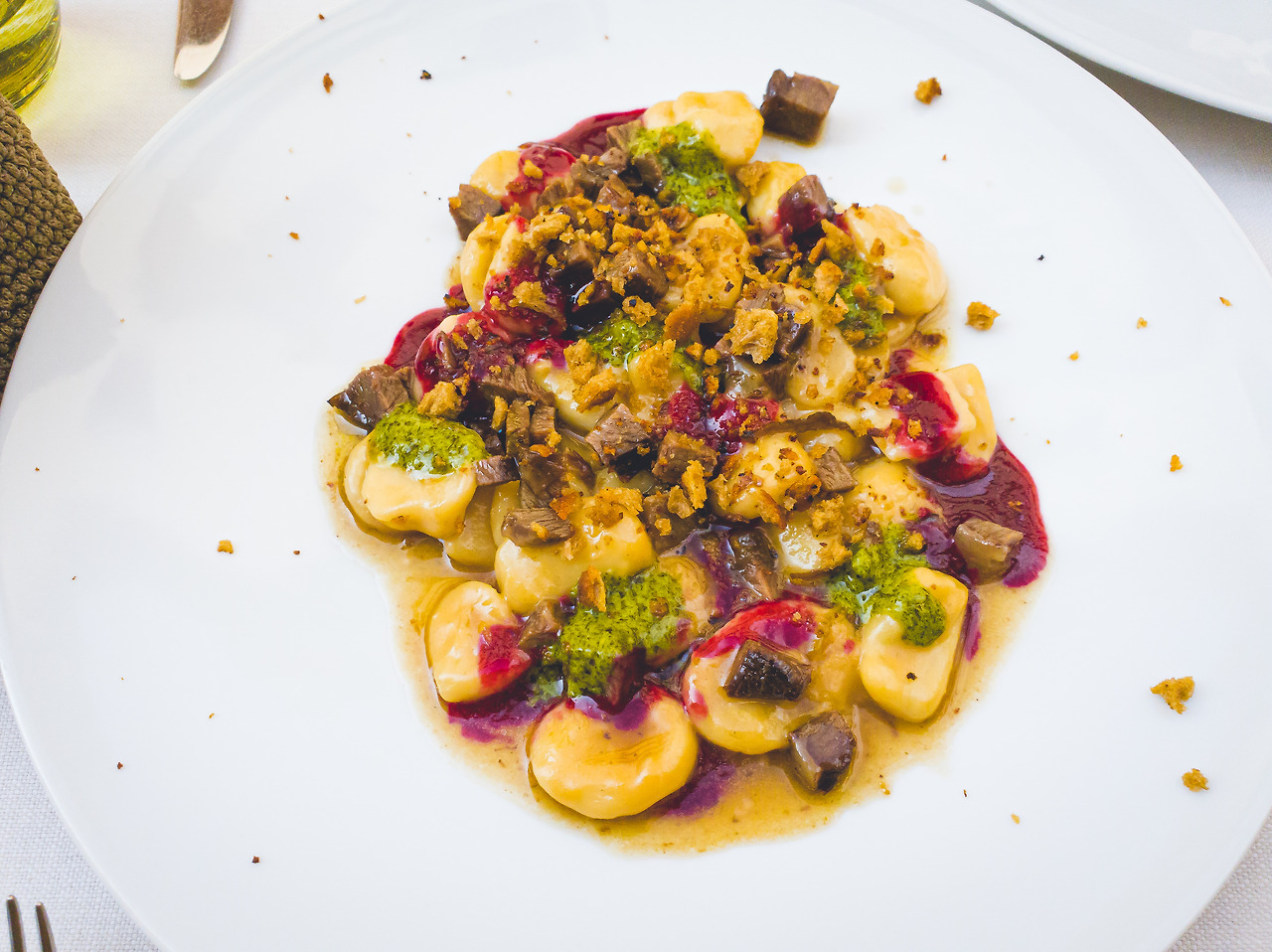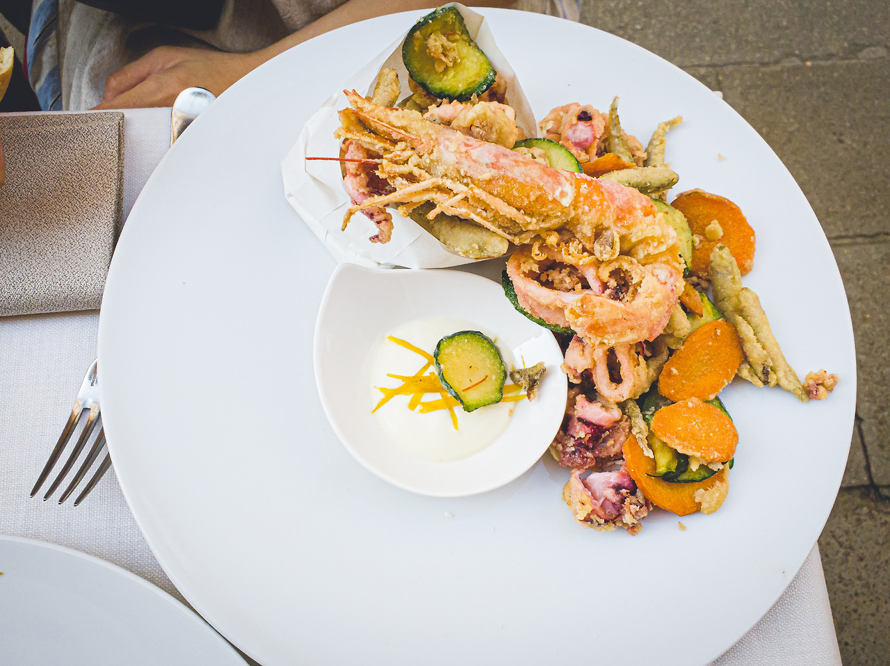그냥 건너지 말고 근처에서 일단 점심을 해결하기로 마음먹었습니다. 알베르토 어쩌고 하는 식당에서 점심을 먹었는데, 첫째 날, 짠 음식에 충격을 먹은 터라 아주아주 짜지 않을 것 같은 음식으로 시켰어요. 홈메이드 비프 뭐시기 파스타랑 프루떼 뭐시기 튀김(이 식당에서 가장 인기 있는 듯했어요)을 주문했습니다.