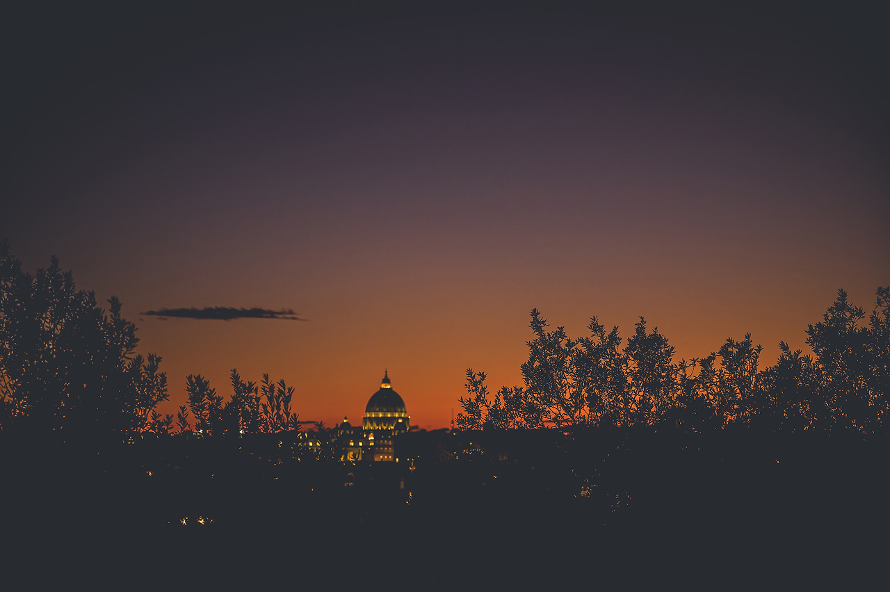 핀치오 언덕 석양 감상을 모두 마치고 나서는 성천사성 야경을 보러 출발했습니다. 성천사성 앞의 다리가 아니라 움베르토 다리라는 곳으로 향했어요. 이 곳에서는 성천사성 다리의 야경을 볼 수 있습니다. 성천사성은 나무에 가려 보이지 않지만, 성천사성 앞다리를 전경으로 한 성 베드로 성당의 모습은 정말 아름다웠어요