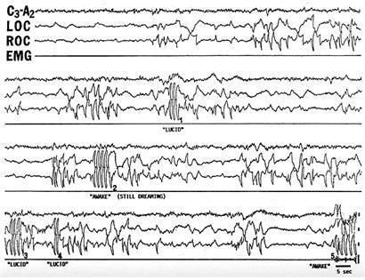 Figure 3는 드리머가 REMP 도중 활성화 되어있는 호흡근육의 의식적인 제어여부를 확인하고자 이행한 실험에서 얻은 데이터이다.(LaBerge, 2000) 왼쪽 안구의 움직임을 기록한 EOG(Electrooculargram)를 본다면 드리머는 총 세 개의 신호를 보냈다는 것을 알 수 있다. 드리머가 꿈의 세계에서 보낸 첫 번째 신호 이전까지 10초에 두 번 정도였던 호흡 속도는 신호 이후 10초에 14번 정도로 빨라졌고 5초 이후 두 번째 신호와 함께 다시 느려졌다. 두 번째 신호가 끝나고 드리머는 약 10초간 숨을 멈췄다. 그후 참았던 숨을 다시 쉬겠다는 마지막 신호와 함께 드리머는 호흡을 재개했다. 라버지는 대부분의 수의근 운동이 차단되는 REMP에서조차 호흡근육과 안구근육의 운동마저 막지는 못한다는 점에 착한, 이를 역이용해 꿈속에서 현실로 시그널을 보내는 실험에 성공한 것이다.