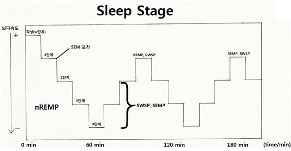 수면단계(sleep stage)는 일반적으로 비역설수면기(non-Rapid Eye Movement Phase, nREMP)와 렘수면인 역설수면기(Rapid Eye Movement Phase, REMP)로 구분된다. nREMP는 추가적으로 1단계(얕은 잠), 2단계(조금 깊은 잠), 3단계(깊은 잠), 4단계(매우 깊은 잠)까지 총 4단계로 나뉘게 된다. nREMP에서의 드리머는 수면단계가 상승할수록 뇌파속도가 현저히 떨어지며 낮은 주파수의 델타활동이 나타나는 3-4단계의 서파수면기(Slow Wave Sleep Phase, SWSP)에 진입하게 된다. 뇌는 이에 따라 4헤르츠 미만의 주파수를 보내는 동시에 급속안구운동과는 달리 느린 안구운동(Slow Eye Movement Phase, SEMP), 즉 셈(SEM)수면단계에 진입한다. nREMP와 REMP가 교체되는 주기는 일반적인 수면단계에서 대략 90분정도인데 이를 그래프로 표현해보면 다음과 같다.