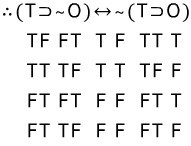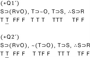 여기서 볼 수 있듯이 (Q1)의 해석을 채택한다면 부정되는 것은 후건이지만 (Q2)의 해석을 채택한다면 명제 T⊃O 자체가 부정된다. 즉, 논증 (Q)는 다음과 같은 두 가지의 방식으로 해석될 여지가 있다.