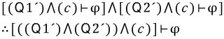여기서 볼 수 있듯 우리는 논증 (*Q1')과 (*Q2')의 부당성을 보이는 데에 실패했다. 논증 (*Q1')과 (*Q2')이 부당하다는 가정 하에 진리치를 채워나가던 도중 모순을 발견했기 때문이다. 즉 나는 막 (*Q1')과 (*Q2')이 타당한 논증이라는 사실을 증명한 셈이다. 그러므로 전제 2번에 (Q1')을 대입하건 (Q2')을 대입하건 논증 자체의 정당성에는 큰 영향을 미치지 않는다는 결론을 내릴 수 있다. 그런데 만약 그렇다면 언명 (E1)에 대한 해석을 굳이 (Q1)과 (Q2)로 구분할 필요가 있는가? 만약 양자가 양립가능하다면 앞서 살펴본 구문론적 애매성의 문제는 해소되는 듯이 보인다. 그렇다면 (*Q1')⊕(*Q2') 인가, 아니라면 (*Q1')∨(*Q2')인가? 여기까지의 논의가 합당하다면 정답은 후자로 보인다. 각 전제 1과 3의 연언을 (c)라는 복합명제로, 결론을 φ로 표현한다면: