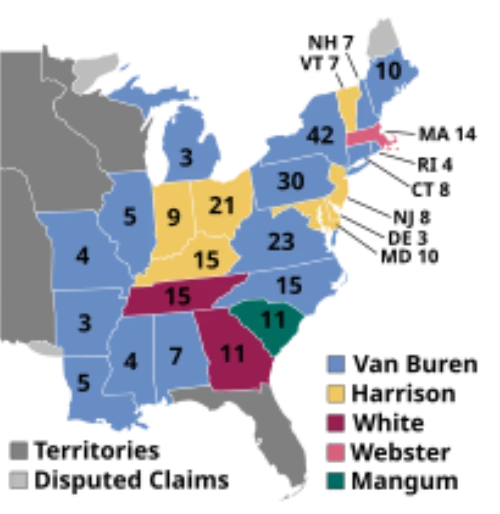 [해월] 그러게 말이야. 1830년대 미국에서 벌어진 ‘2차 정당체계’(second party system)로 퀸지가 소속한 ‘반메이슨당’과 ‘국민공화당’ 그리고 앤드류 잭슨의 반대파들이 모두 모여 ‘위그당’(Whig Party)으로 결합하고 그에 맞서는 민주당 등 크게 두개의 당으로 재편되었지. 오랜 민주당 정권에 맞서 강력한 권력을 가진 대통령체제를 반대하고 의회주의를 주장했던 위그당은 드디어 9대, 10대, 12대 그리고 13대 대통령을 배출하게 돼. 퀸지는 1836년에 13번째 대선이 치러질 때 위그당의 대통령 후보 출마자들을 모두 혐오한 나머지 후보로 나서지 않았어. 민주당의 '마틴 밴 뷰랜'(Martin Van Buren. 1782-1862)에 대적해 위그당에서는 '윌리엄 헤리슨'(William Henry Harrison), '휴 와이트'(Hugh L. White), '데니얼 웹스터'(Daniel Webster), 그리고 '윌리 멩검' (Willie P. Mangum) 등 네 사람이나 출마했어. 결과는 명약관화했지. 결국 8대 대통령으로 뉴욕 주 출신 민주당 후보 ‘마틴 벤 뷰랜’이 선거인단 294표 중 170표를 얻어 선출되었지. 퀸지와 마틴은 정적이었지만 재임기간 동안 서로 정중한 관계를 유지하면서 지냈어.