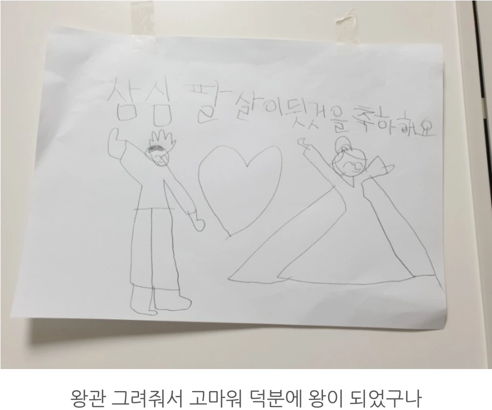일어나 결혼식을 준비해둔 내 방에 와보니 손수 그린 축하 그림이 걸려있었다.