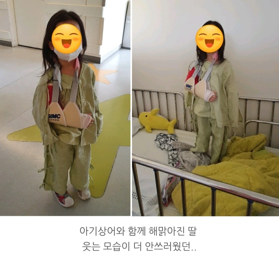 수술을 마친 딸의 사진을 본 순간 안쓰러웠지만 너무 귀여워서 사태의 심각성을 잊어버리고 피식해버리고 말았다. 내가 출장 보내준 아기 상어와 잘 잔 덕분인지 표정도 밝았다.
