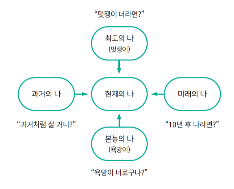 한편 나태해질 때는 “과거처럼 살 거니?”라고 다그치는 후회스러운 모습의 ‘과거의 나’를 소환하고, 후회 없는 의사결정을 해야 할 때는 꿈을 이룬 ‘미래의 나’에게 묻기도 한다. 자신 안에 있는 나에게 이름을 붙여 수시로 성찰하는 것도 좋은 방법이다. 성찰은 최대한 자신을 객관적인 시선에서 바라보려는 노력에서 출발한다.