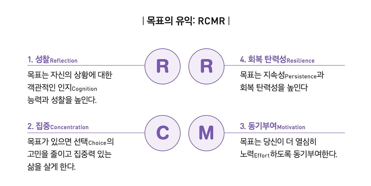 넷째, 목표는 지속성과 회복탄력성(Resilience)을 높인다. 명확한 목표는 어려움이나 좌절에 직면할 때 이겨낼 수 있는 강력한 원동력이 된다. 역경 속에서도 회복력을 향상시키고, 좌절을 성장과 학습의 기회로 바꿀 가능성도 높인다. 또 목표는 목적의식과 방향을 제공하여 도전 과제와 비상 상황까지 예측하고 현실적으로 준비하게 만든다.