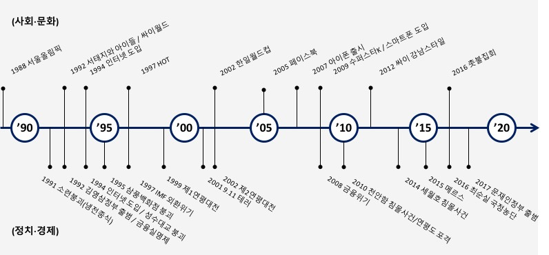이상에서 살핀 것처럼 각 세대에는 지나온 삶의 이정표만큼이나 다른 인생의 나이테가 그려져 있다. 시대별 사건에는 각 세대를 이해하는 중요한 단서들이 마치 숨은그림찾기처럼 감춰져있다. 다음 도표는 요즘 것들을 이해할 수 있는 발자취들이다.