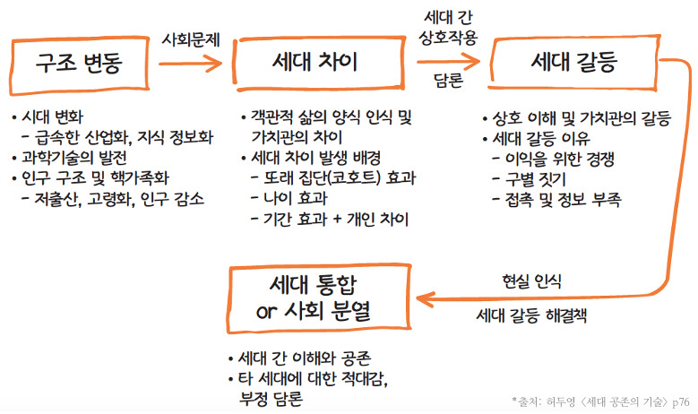 첫째는 시대의 변화이다. 우리나라는 급속한 산업발전을 이뤘다. 압축된 변화로 인해 각 세대는 생애주기에서 각기 다른 역사적 사건을 겪었다. 세대 간 경험의 단절로 다른 가치관이 형성된 것이다.