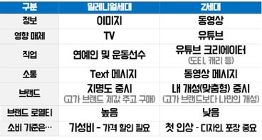 같은 신세대이지만 Z세대는 밀레니얼(Y) 세대와 좀 다르다. 밀레니얼 세대는 텍스트와 이미지로, Z세대는 동영상을 통해 정보를 얻고 소통을 한다. Z세대는 ‘유튜브 세대’라고도 부르는데, 그만큼 동영상, 유튜브 크리에이터의 영향이 크기 때문이다. 또한 밀레니얼 세대가 브랜드의 지명도를 중시한다면, Z세대는 고가 브랜드보다 자기만의 개선을 더 중시한다. 그래서 브랜드에 대한 로열티도 낮은 편이다. 소비 기준도 다르다. 밀레니얼 세대가 가성비를 따진다면, Z세대는 디자인과 포장 등 첫인상을 중요하게 여긴다.