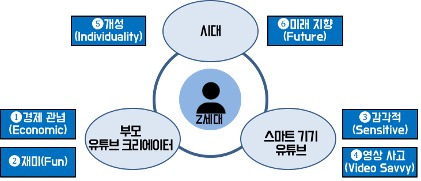 둘째, 스마트 기기와 유튜브이다. 2007년 출시된 아이폰의 출시는 스마트 기기의 시작을 알렸다. Z세대는 스마트 기기의 최대 수혜자이다. 누가 가르쳐주지도 않았는데 어려서부터 스마트기기를 자유자재로 다룬다. 특히 유튜브는 그들의 일상에 깊숙이 침투했다. 직관적이고 개성을 중시하는 특성에 영향을 준다.
