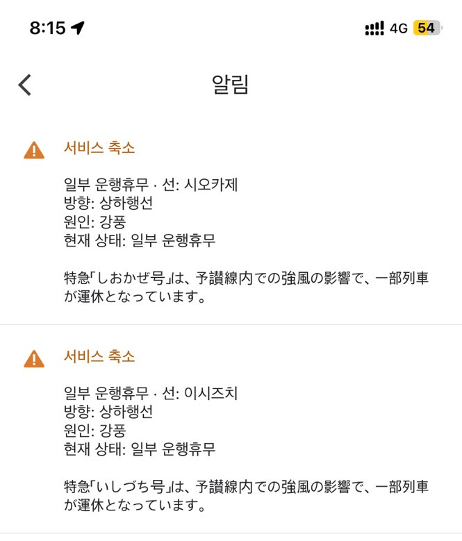 서점에서 나와 슬슬 역으로 돌아가서 기다리다가 열차를 타면 되겠다는 생각에 역으로 걸음을 옮겼다. 혹시 조금 더 빠르게 출발하는 열차가 있을까 싶어, 구글 지도로 역의 시간표를 찾아보았다. 이때 본 시간표에는 아까 배에서 본 것과 다른 표시가 되어있었다. 누가봐도 경고를 알리는 빨간색 배너에 ‘!’ 표시, 게다가 아까 타고 온 열차의 이름까지 적혀있었다. 이 경고문구는 열차 운행중단안내였다.