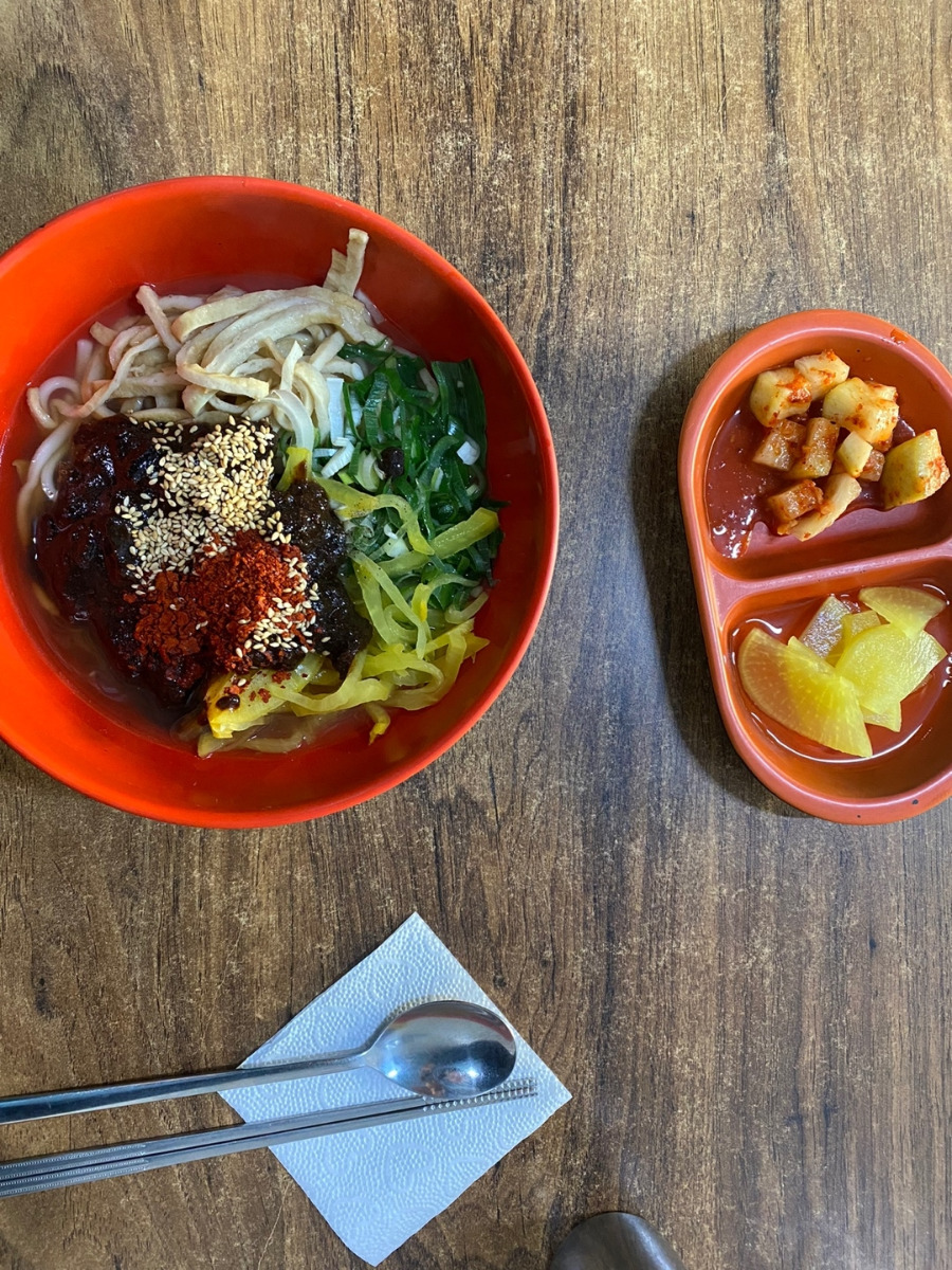 우짜는 말 그대로의 비주얼이었다. 한 그릇의 우동이 있고, 그 위에 짜장을 한 국자 퍼 얹었다. 그릇에 덩그러니 올라가 있는 짜장소스가 어떤 섬 같기도 했고, 정말 적응 안 되는 비주얼이었다. 짜장도 아니고 우동도 아닌 이게 뭘까 싶어, 한참을 가만히 보고 있었다. 그리고 뭐 먹는 법이야 다 똑같겠거니 생각해서 바로 섞었고, 한 젓가락 떠서 먹어보았다.
