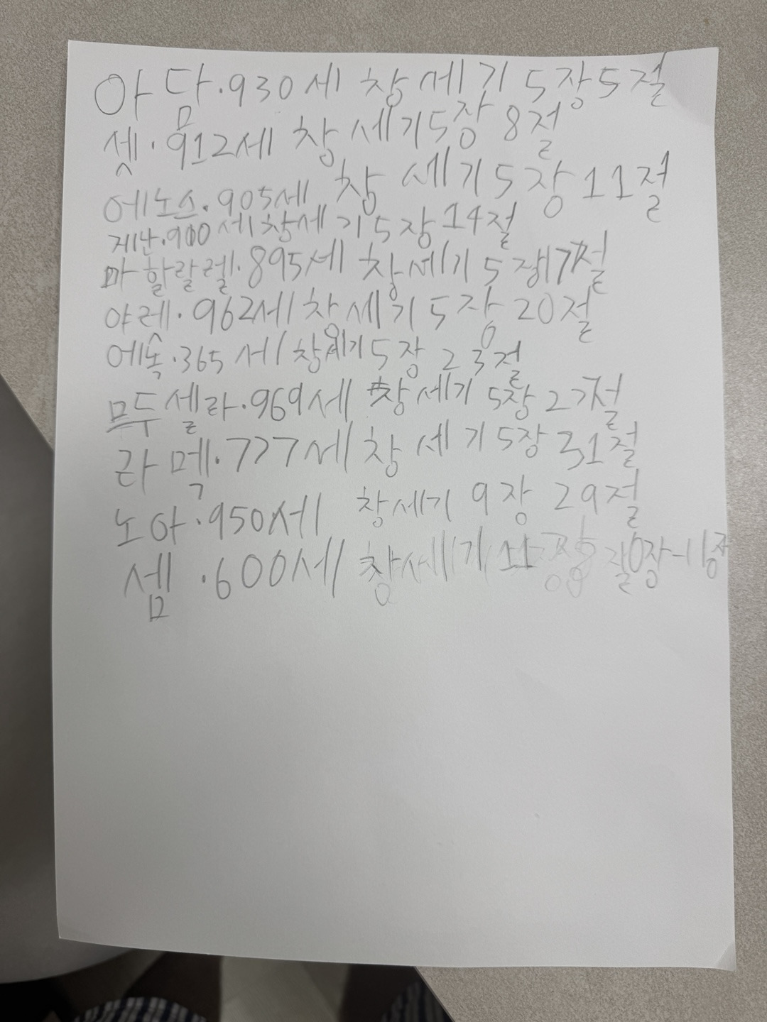 만약 내가 누구는 몇 살까지 살았고 하며 므두셀라가 정말 오래 살았지라고 흥미성 정보만을 주었다면 거기서 끝났을 것이다. 그러나 본인이 직접 성경에서 그것을 찾게 함으로써 텍스트를 읽고 찾는 연습을 하는 과정을 겪으며 분명 성경 안에서의 내용에 대해 꼼꼼히 보는 과정을 겪었을 것이다.