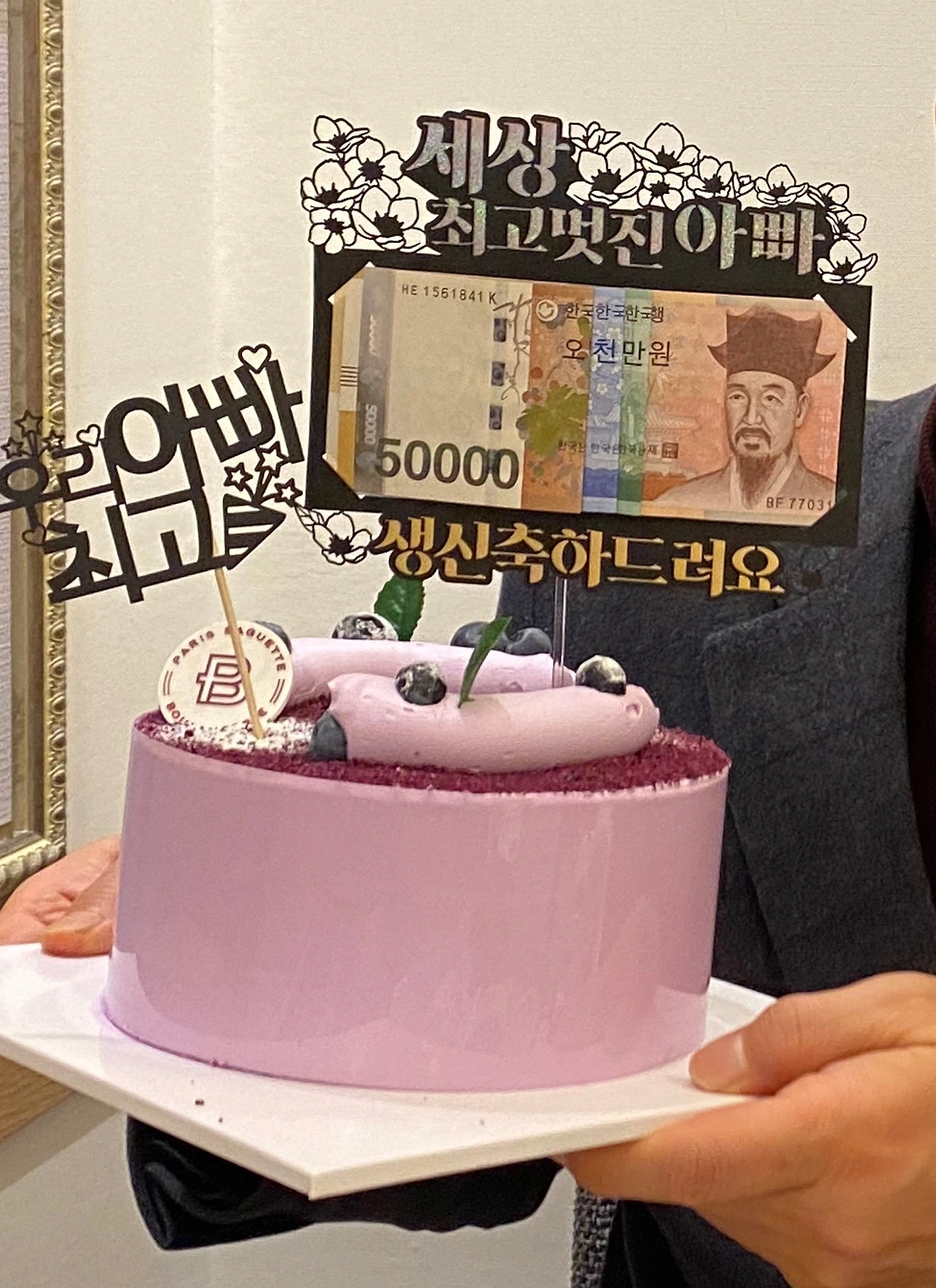 기나 긴 코스 음식이 끝나고 마지막으로 수정과와 과일이 나왔다. 이때다 싶어 케익을 슬그머니 꺼냈다. 하지만 주인공은 따로 있었다. 인싸들만 할 것 같이 생긴 오천만 원이 꽂힌 토퍼!