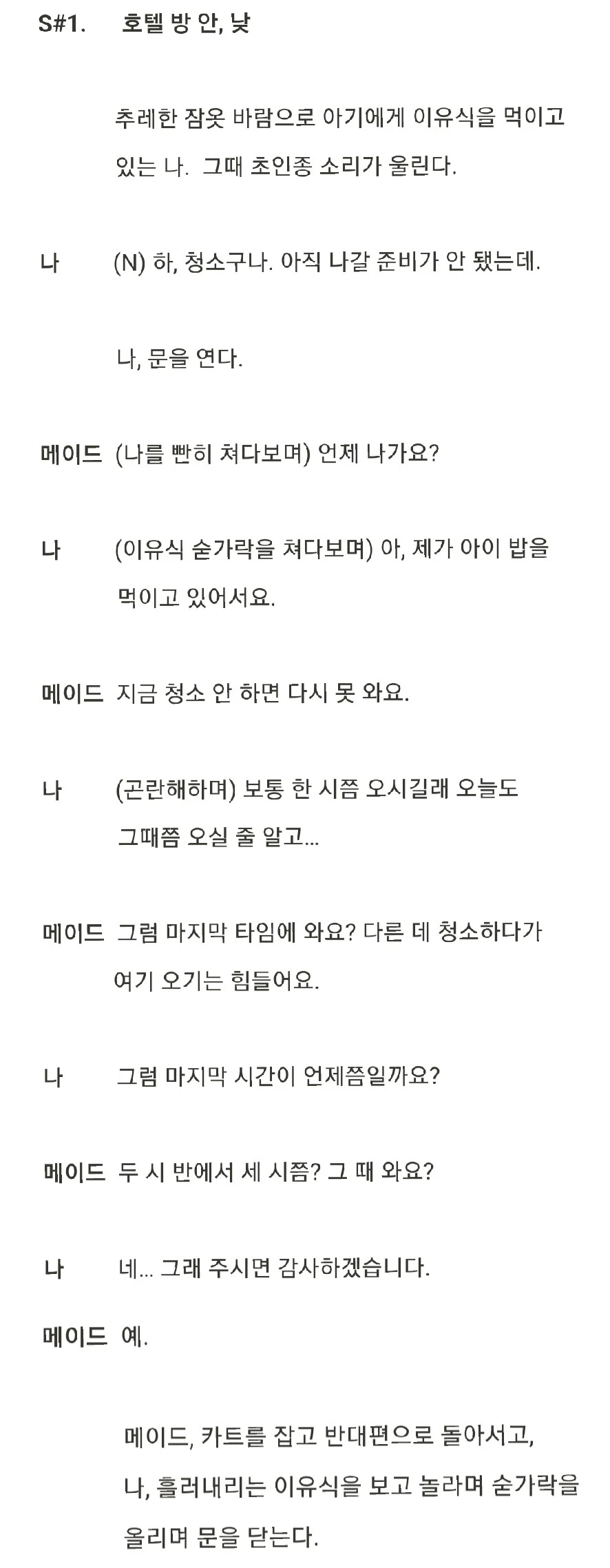 당연히 죄송해하지 않으셔도 되지만 감사했다. 그리고 “아직 계시네요.” 이 말은 사실 그대로를 서술한 것인데 존중받는 느낌이었다. “미처 나가지 못하셨군요. 당황하셨겠네요.”라는, 하지도 않은 말이 들리는 듯했다. 이유식 숟가락을 들고 있는 내 모습과 밥을 주다 말고 사라진 엄마를 찾는 아이의 “엥-”소리에 상대는 “에고, 아이가 있나 보네요. 어쩌나.”라고 말했다. 역시나 사실뿐이었지만 나도 모르게 “네ㅠ 아이 밥만 먹이고 나가려고 했는데 그게 잘 안 됐어요ㅠ 저 옷도 다 입었고 유모차도 다 펼쳐놨는데요ㅠ”라며 주책을 떨 뻔 했다. 이번의 대화도 전과 동일하게 마무리되었다. 상대는 다른 곳을 먼저 청소하고 오겠다라고 말한 후 돌아 나갔다.