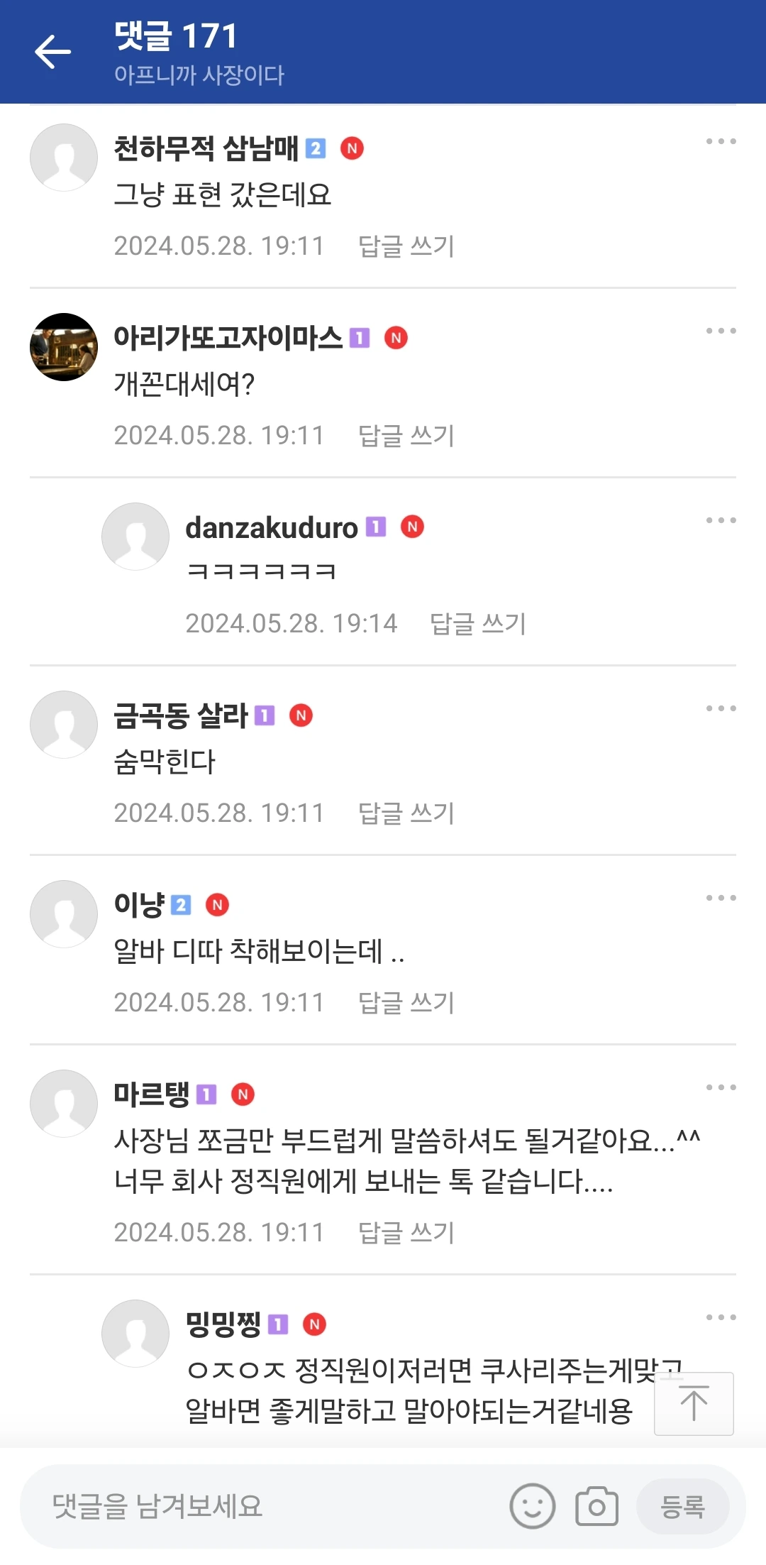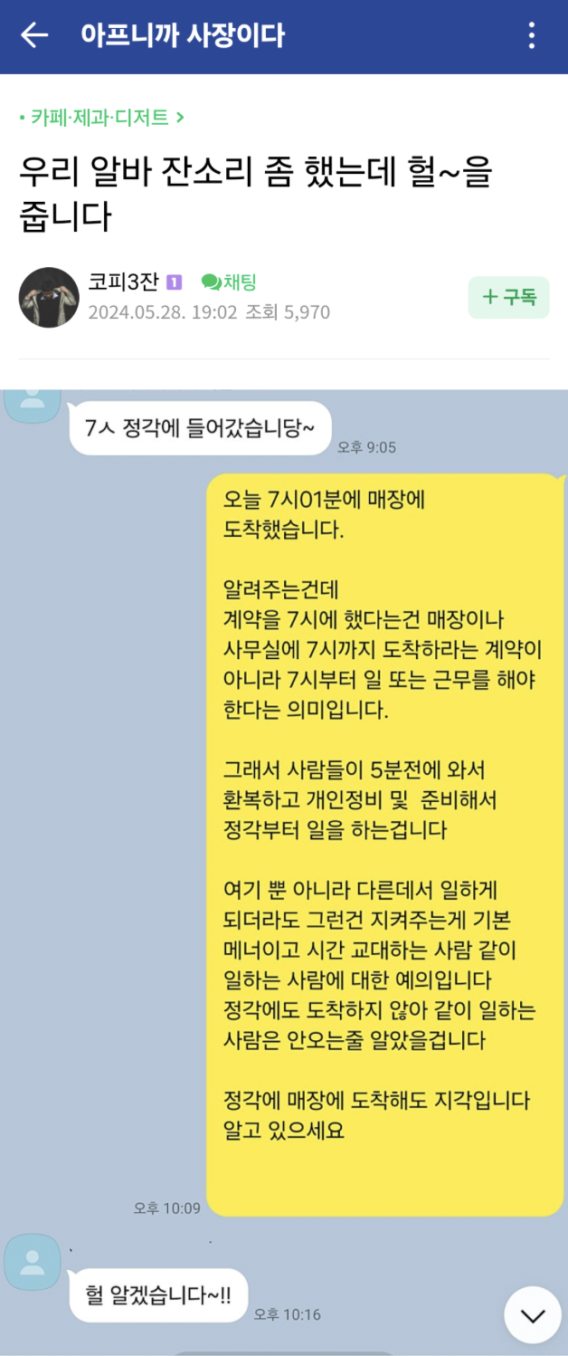 자영업을 운영하고 있는 후배가 카톡을 보내왔다. 자영업 사장님들 카페인 '아프니까 사장이다'에 아래와 같은 글이 올라왔는데, 많은 댓글이 알바 편을 들면서 사장을 꼰대로 취급한다는 것이었다. 자신은 당최 이 댓글이 이해가 안 된다며, 내 의견을 물어왔다.