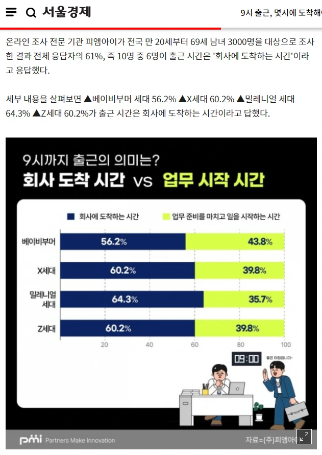 작년에 시행한 설문조사 결과 출근시간의 의미에 대해 응답자의 61%가 '업무시작시간'이 아니라 '회사에 도착하는 시간'이라고 응답했다. (출처: https://www.sedaily.com/NewsView/29S9NU6ZXS) 베이비부머 세대를 제외하고는 오히려 세대 간의 차이가 생각보다 크지 않음을 알 수 있다. 오히려 응답자의 나이보다는 응답자의 근무환경을 고려했어야 아닌가 싶다.