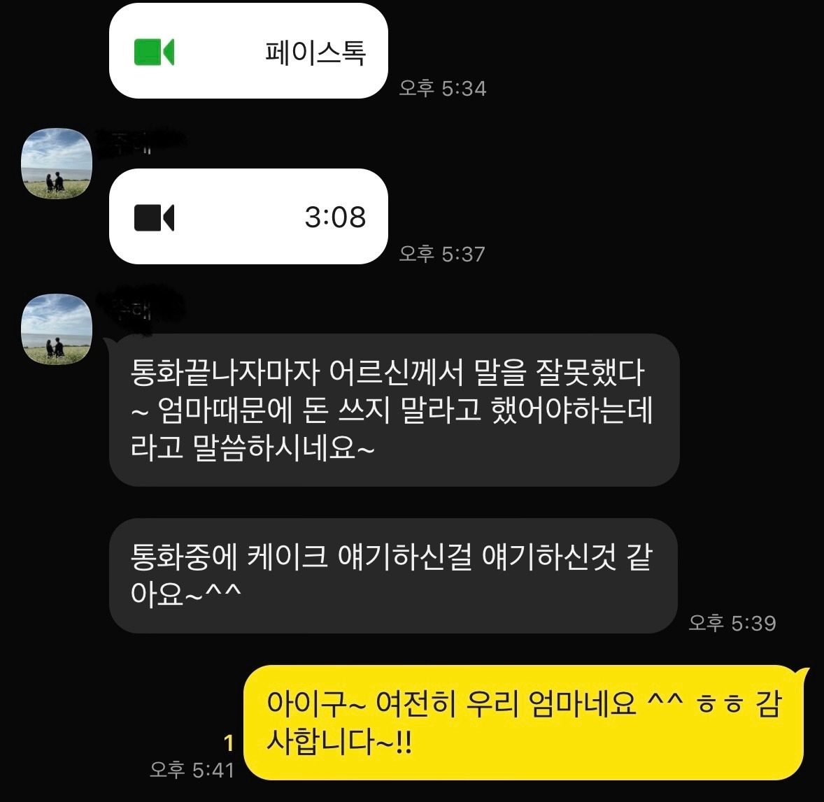 "알겠어 엄마. 내가 엄마 좋아하는 고구마 케이크랑 맛있는 거 많이 사가지고 엄마 보러 갈게~"