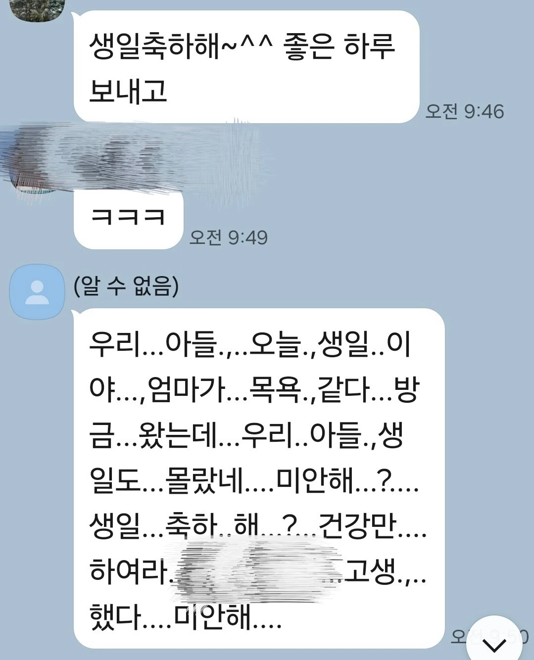 -우리...아들.,...오늘.,생일..이야...,엄마가...목욕.,같다...방금...왔는데...우리..아들.,생일도...몰랐네...미안해...?....생일...축하..해...?...건강만....하여라...