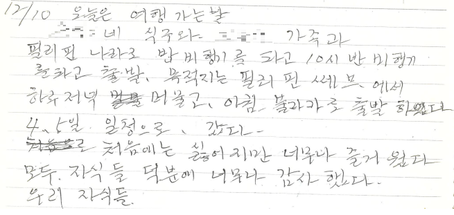 '오늘은 여행 가는 날. OO(언니)네 식구와 OO(나) 가족과 필리핀 나라로 밤비행기를 타고 10시 반 비행기를 타고 출발. 목적지는 필리핀 세부에서 하루 저녁 머물고, 아침 보홀로 출발하였다. 4박 5일 일정으로 갔다. 처음에는 싫었지만 너무나 즐거웠다. 모두 자식들 덕분에 너무나 감사했다. 우리 자식들...'