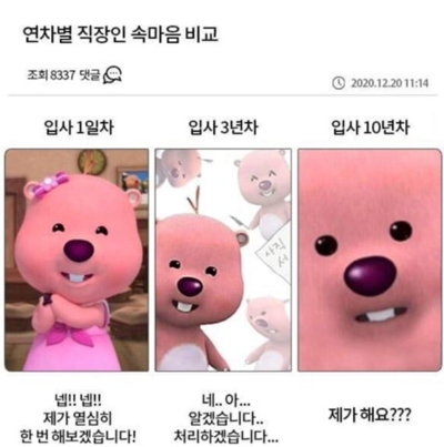 뽀로로 속 루피의 원래 성격은 겁이 많고, 예민하며, 수줍음이 많은 캐릭터였습니다. 그런데 순수했던 루피가 세상에 때 묻으며 점점 흑화(?)하고 험한 말을 내뱉기 시작했죠. 마치 사회초년생이 속으로 삭히던 말을 대신 내뱉어 주는 것처럼 보였고, 20~30대 직장인들의 폭발적인 공감을 얻었습니다.