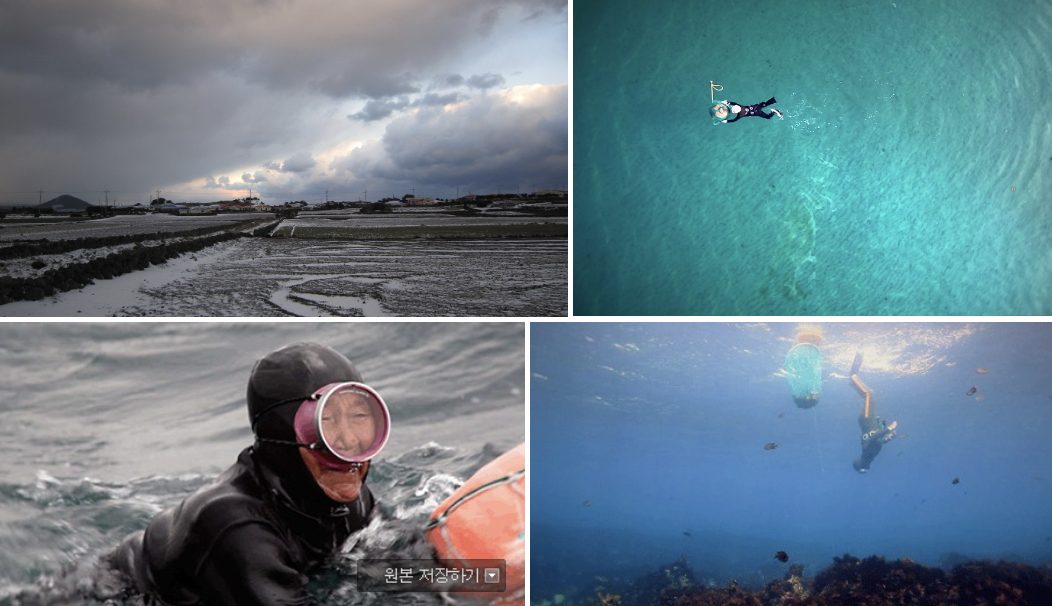 얼마 전 방영되어 큰 인기를 끌었던 제주를 배경으로 한 드라마를 통해 이제는 많은 사람들에게 익숙해진 해녀들의 삶, 그리고 물 안과 밖 두 개로 나뉜 그들의 세계가 영화를 통해 펼쳐진다. 그들의 해녀들 간의 계급 수심 3m에서 물질하는 상 하군(똥군), 5-9m를 잠수할 수 있는 중군, 15-20m를 잠수하는 상군으로 나뉜다. 철저한 능력에 기반한 계급사회, 그들의 숨에 의해 정의되는 능력이다. 상군 해녀들은 최고 3분까지 숨을 참을 수 있는 능력을 갖고 있다. 그리고 상군 중 가장 높은, 그러니까 가장 숨이 긴 대상군은 거의 두 배에 가까운 시간 동안 물질하고 일반 하군들의 몇 배나 되는 수확을 거둔다. 숨과 바꾼 수확이다. 영화 속 우도의 봄, 여름, 가을, 겨울을 해녀의 눈으로 기억한다. 봄의 우뭇가사리, 여름의 태풍과 물고기 사냥, 남방고래와 함께 오는 가을의 바다, 그리고 차가운 눈보라 속 겨울의 바다.