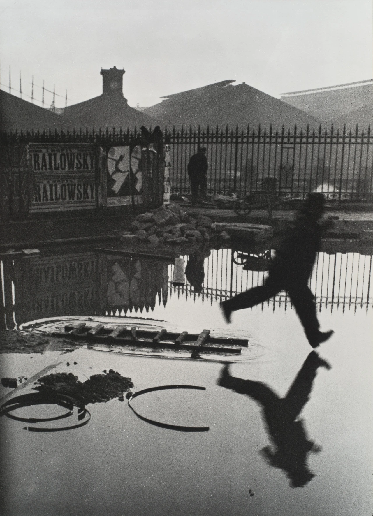 아래 사진은 브레송의 ‘결정적 순간’ 미학을 가장 잘 보여주는 대표작이다. 그는 말 그대로 모든 것이 완벽하게 맞아떨어지는 마법 같은 순간, 찰나를 포착했다. 공중에 떠 있는 남자는 영원히 정지한 듯한 느낌을 준다. 발이 땅에 닿기 전, 그 극적인 순간을 담아내어 긴장감과 역동성을 동시에 표현한다. 사진 속 기하학적이고 대칭적인 구도는 탁월하다. 남자의 실루엣과 물에 비친 그림자가 마치 데칼코마니처럼 대칭을 이루고, 초현실적이고 몽환적인 분위기를 더한다. 곡선과 직선의 대비와 조화, 배경의 발레리나 포스터와 움직임이 겹치며 시각적 리듬감을 주어 사진의 완성도를 높인다. 이 사진은 단순히 구조적 아름다움뿐만 아니라 스토리와 의미를 담고 있다. 물웅덩이를 건너 도약하는 움직임은 삶에 대한 도전과 앞으로 나아가는 인간의 보편적 모습을 상징한다. 브레송은 이러한 요소들이 완벽히 조화를 이룰 때, 사진이 단순한 기록을 넘어 예술로서 기능함을 보여준다.