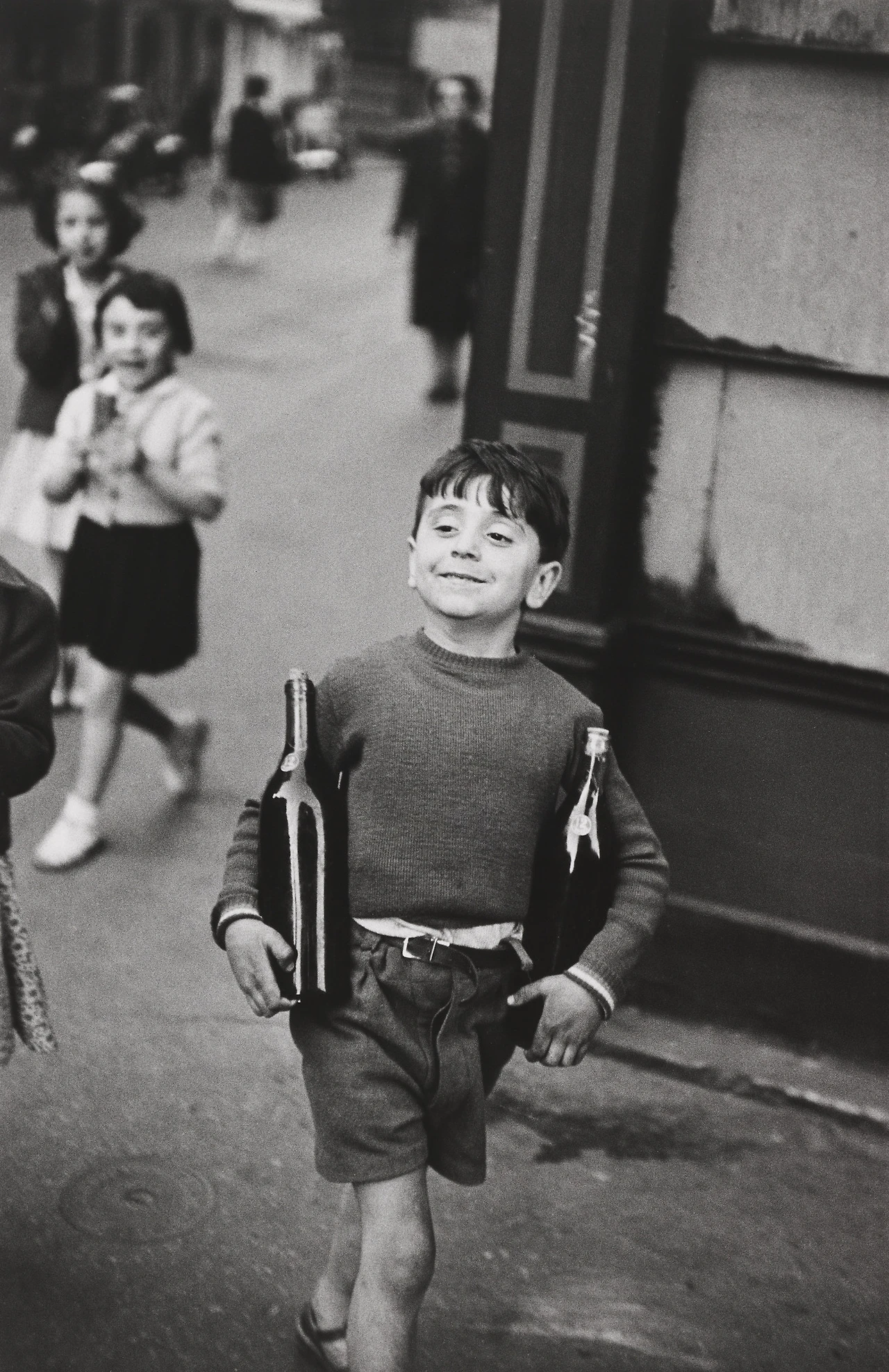 아래는 그가 라이카로 찍은 대표작 중 하나인 〈Rue Mouffetard, Paris〉다. 당시 라이카는 다른 카메라에 비해 작고 가벼워, 거리의 자연스러운 일상의 순간을 포착할 수 있었다. 브레송이 눈에 띄지 않았기 때문에, 사진 속 인물들은 카메라를 의식하지 않아 자연스러운 표정과 몸짓을 보여준다. 사진 속 소년은 커다란 와인병 두 병을 안고 당당하게 걸어가고 있다. 그의 환한 웃음과 뒤쪽에서 초점이 살짝 흐려진 소녀들의 표정이 하나의 작품으로서 완벽한 순간에 담겼다. 거리의 기울어진 선, 주변 인물들의 배치, 소년의 걸음걸이까지 모두 조화를 이루며 완벽한 구도를 만들어낸다. 무엇보다 당시 파리 서민들의 삶이 사진 안에 따뜻하게 녹아 있어, 와인병을 들고 가는 아이의 일상적인 풍경이 보는 이에게 재미와 감동을 선사한다.