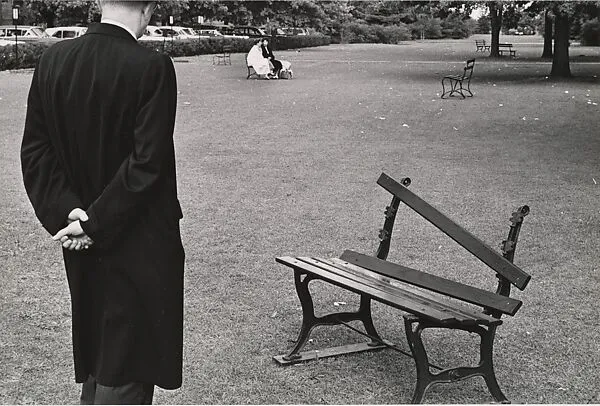 그의 작품 <고장난 벤치(Broken Bench)>는 이러한 특징을 잘 보여준다. 사진 속에는 인물과 사물이 함께 등장하지만, 첫 시선은 자연스레 벤치에 머문다. 등받이가 뒤틀리고 부러진 벤치는 더 이상 사람이 기대어 앉을 수 없는 상태다. 인간의 휴식과 관계를 상징하던 벤치가 ‘기능을 잃은 존재’로 나타나며, 사진 전체에 외로움과 단절의 감정을 불러일으킨다. 멀리에는 멀쩡한 벤치와 그 위에 앉은 사람들이 보인다. 단 하나의 벤치만이 고장 나 있다는 점은 대비를 더욱 강하게 만들어, 사회 속에서 소외된 ‘한 존재’를 부각시킨다. 사진의 왼쪽에는 검은 코트를 입은 한 남자가 등을 돌린 채 서 있다. 얼굴이 보이지 않아 익명성이 강조되지만, 동시에 그는 마치 케르테스 자신처럼 느껴진다. 그는 벤치를 응시하고 있지만, 정작 벤치에 앉지 못하고 서 있다. 마치 자신이 속하지 못하는 세상을 바라보는 듯한 그 시선에는 도시 속의 고독, 인간 관계의 단절, 그리고 이방인으로서의 자의식이 스며 있다. 이 작품은 단순한 풍경 사진이 아니라, ‘존재의 불안’과 ‘관계의 단절’을 상징적으로 표현한 자화상과도 같다. 케르테스는 외로움을 기록하지 않고, 외로움 자체를 빛과 형태로 번역해냈다.