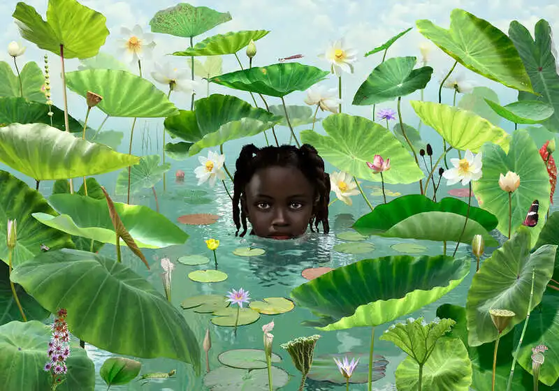 아래의 작품은 그의 가장 잘 알려진 시리즈인 World 중 한 장면이다. 얼핏 보면 회화처럼 보이지만, 자세히 들여다보면 모든 요소가 카메라로 촬영된 이미지임을 알 수 있다. 그러나 그것은 우리가 살아가는 현실의 풍경이라고 보기에는 지나치게 부자연스럽거나, 오히려 너무 완벽해 비현실적으로 느껴진다. 연못 속에 서 있는 흑인 소녀의 얼굴, 피부, 머리카락은 한 사람의 모습을 그대로 담은 것이 아니라, 여러 이미지에서 가져온 조각들이 결합된 결과다. 하늘과 연못, 나뭇잎과 줄기, 꽃들 역시 마찬가지다. 수천, 혹은 수만 장에 이르는 디지털 이미지들이 층층이 쌓여 하나의 장면을 이룬다. 이러한 구성은 피사체에만 국한되지 않는다. 사진에서 분위기를 결정짓는 빛과 색감 또한 철저히 통제되어 있다. 작품 속 공간은 오염되지 않은, 이상적인 낙원처럼 보인다. 반 엠펠은 디지털 포토 콜라주 기법을 통해 관람자를 현실과 닮았지만 결코 현실이 아닌 세계로 끌어들인다.