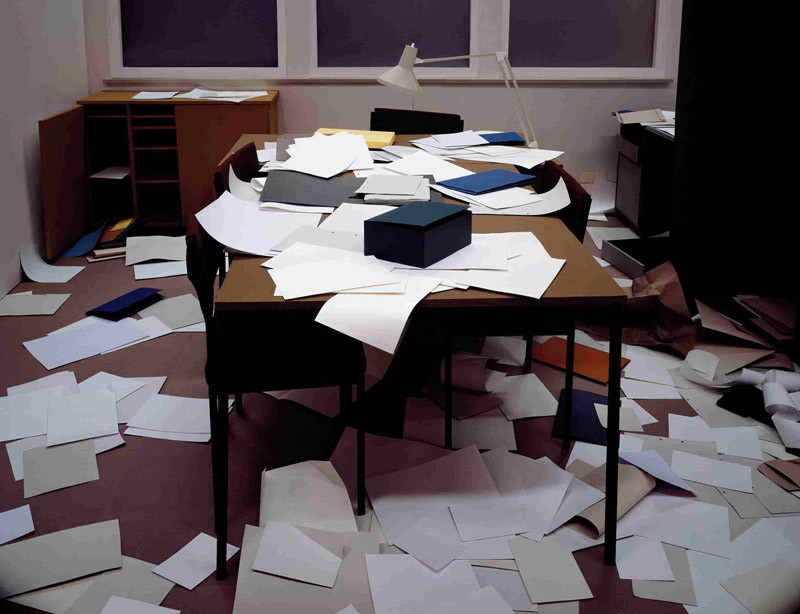 아래의 작품은 동독의 비밀경찰 조직이었던 슈타지(Stasi)의 본부가 시민들에 의해 점거되었을 당시의 현장 사진을 바탕으로 제작되었다. 역사적으로 권력이 붕괴된 그 순간을 그는 <사무실>이라는 작품으로 재현했다. 방 안에는 서류들이 흩어져 있고, 서랍들은 열려 있다. 한때 권력을 유지하던 시스템이 무너진 흔적이 공간에 남아 있다. 그러나 이 사진에는 질감도 없고, 서류에 적힌 내용 역시 모두 사라져 있다. 데만트는 이 사건의 이미지를 자신의 방식으로 해체한 것이다. 실제 역사 속에서 이 서류들은 누군가를 감시하고 억압했던 기록이자 증거였을 것이다. 하지만 그의 사진 속에서 그것들은 의미를 잃은 종이 조각에 불과하다. 데만트는 이렇게 미디어가 부여한 거대한 역사적 의미를 벗겨내고, 이미지가 가진 물질적이고 인위적인 성격을 드러낸다.
