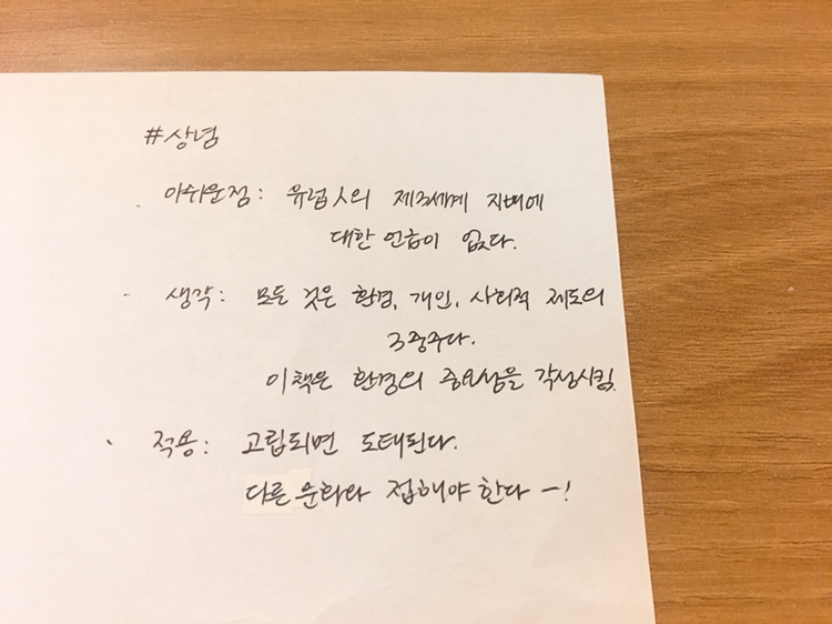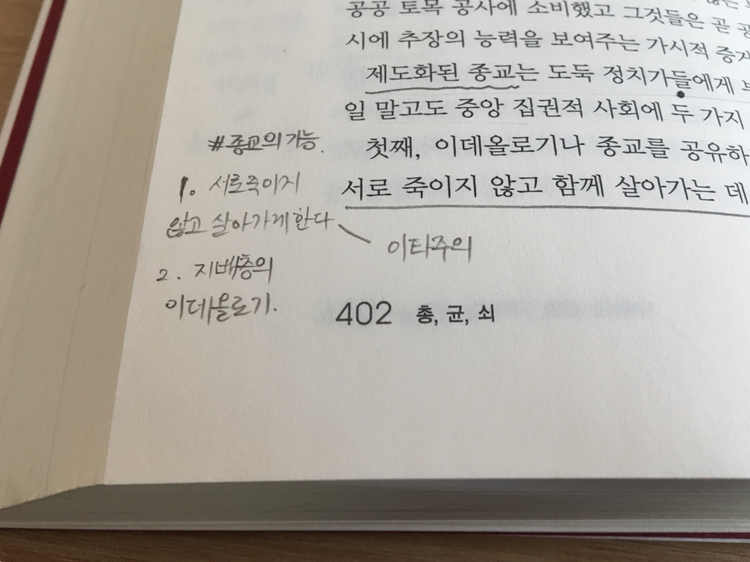 그리고 다른 팁 하나는 도무지 이해가 안되는 부분에 [#그 문단의 주제. 그런데 거의 이해못함.] 이라고 써두면 나중에 그 부분을 차근차근 다시 읽어 보는 것에도 도움이 된다.