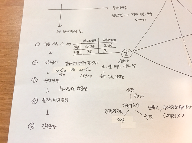 <총,균,쇠>의 경우 600페이지가 넘지만 구체적 증거자료가 많다보니 핵심 메세지만 파악한다면 뺄 수 있는 정보들이 많다. 그런 것들은 과감하게 삭제한다. 이 때 상념을 쓴 조각들을 드로잉에 넣어도 좋다.