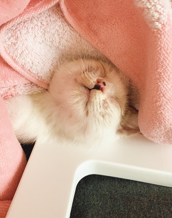신체적인 변화들도 있었다. 2차 심장사상충 예방을 하러 가서 체중을 쟀을 때 여명이는 1.2kg이었다. 불과 2주 전에 980g인 걸 보고 놀랐는데, 또 늘었다. 나는 매일 보니까 애가 큰 것도 모르겠더니, 거의 2주마다 여명이를 만나는 동물병원 선생님은 볼 때마다 여명이가 부쩍 컸다고 하셨다. 그리고 처음에는 허피스 때문에 어딘지 모르게 이상하던 눈과 잔뜩 짓물러 있던 코 옆 피부도 많이 나았다. 하이고...라며 말을 잇지 못하던 부모님도 이제 여명이가 좀 고양이 같다며 신기해하셨다.