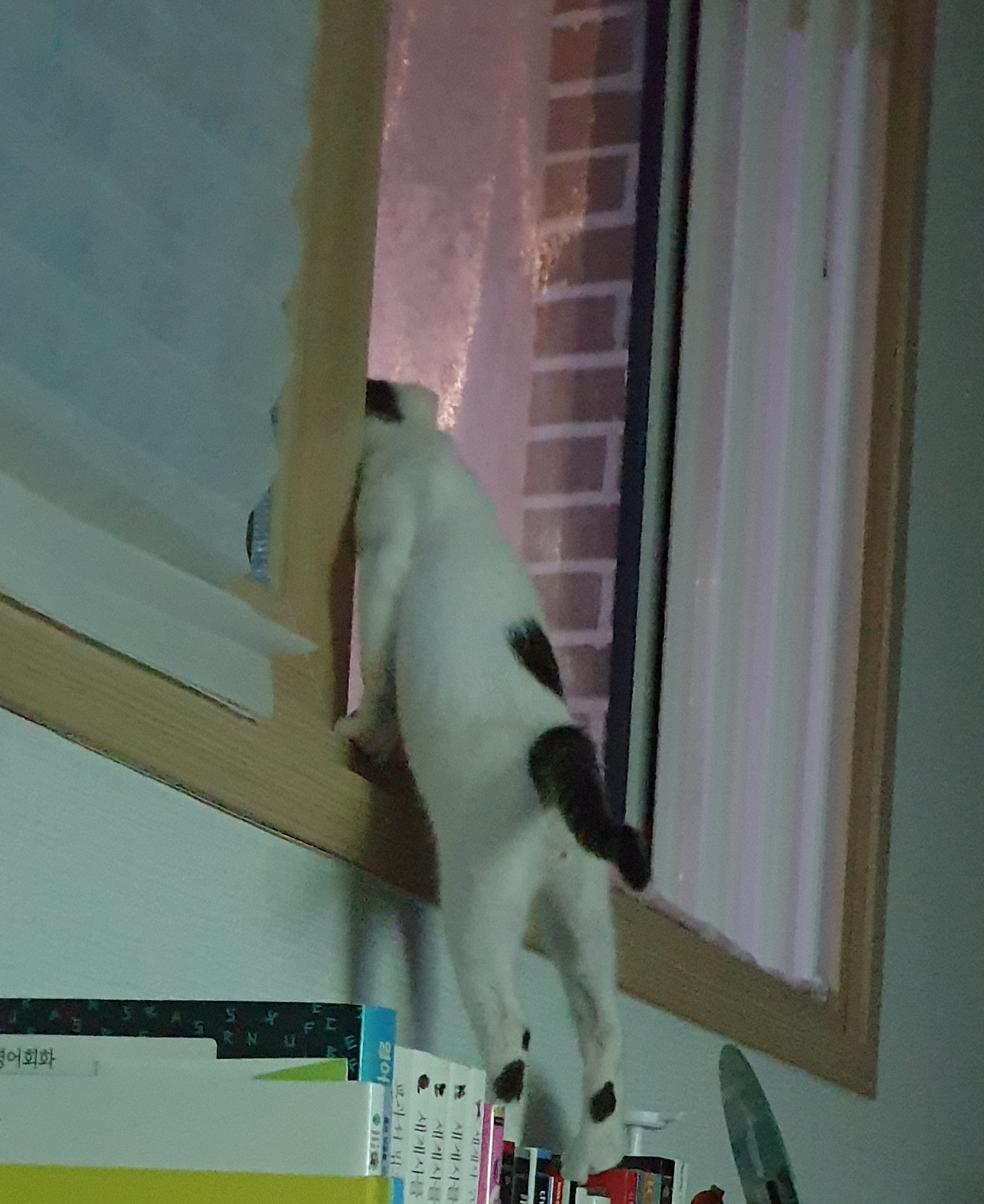 이사를 앞두고 나는 마음이 바빴다. 이사 전에는 여명이가 내 방 창문 근처에 못 올라가도록 네트망으로 철벽 방어를 했었다. 그런데 짧은 3주 동안 여명이는 창문의 매력을 알았다. 여명이는 동생 방 창문으로 밖을 보는 걸 좋아해서 밤낮없이 창틀에 올라가 있었고, 거기서 잠을 자기도 했다. 혹시나 위험할까봐 여명이가 창문 쪽으로 가면 항상 동생이든 나든 창틀 가까이 앉아있었다. 여명이는 사연있는 고양이처럼 아련한 눈으로 창밖을 한참 동안 보곤 했다. 창문의 매력을 알게 된 여명이는 점프력도 일취월장했다. 내가 네트망으로 만든 철옹성은 이제 아무 의미가 없을 터였다.