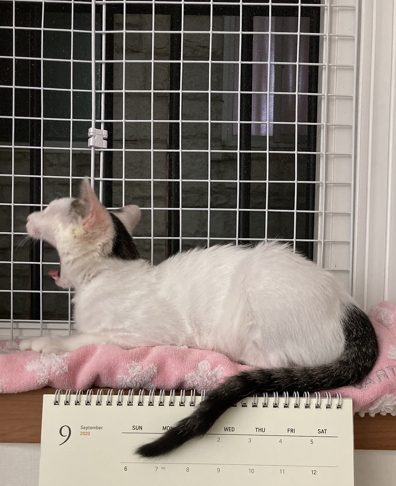 처음 왔을 때는 여유롭게 들어가던 책장 아래에 이제는 엉덩이가 껴서 못 들어가는 게 또 다른 빡침 포인트였던 것 같다. 여명이 너도 어지간히 자기 객관화 안 되는 고양이구나...? 애착 바지를 꺼내 주고 나서야 어느 정도 안정을 찾았는지 여명이는 5시간쯤 지난 뒤에 드디어 밥을 먹기 시작했다. 익숙한 공간에 다시 오는 거니까 좀 더 수월하겠지 싶었는데, 정말 야무진 꿈이었다. 여명이는 처음부터 다시 적응을 시작했고, 사람과 고양이 모두 고생했다. 그래도 처음보다는 훨씬 빠르게 적응을 마쳤다. 특히 이번에 내어준 창문 쪽을 마음에 들어해서 뿌듯했다.