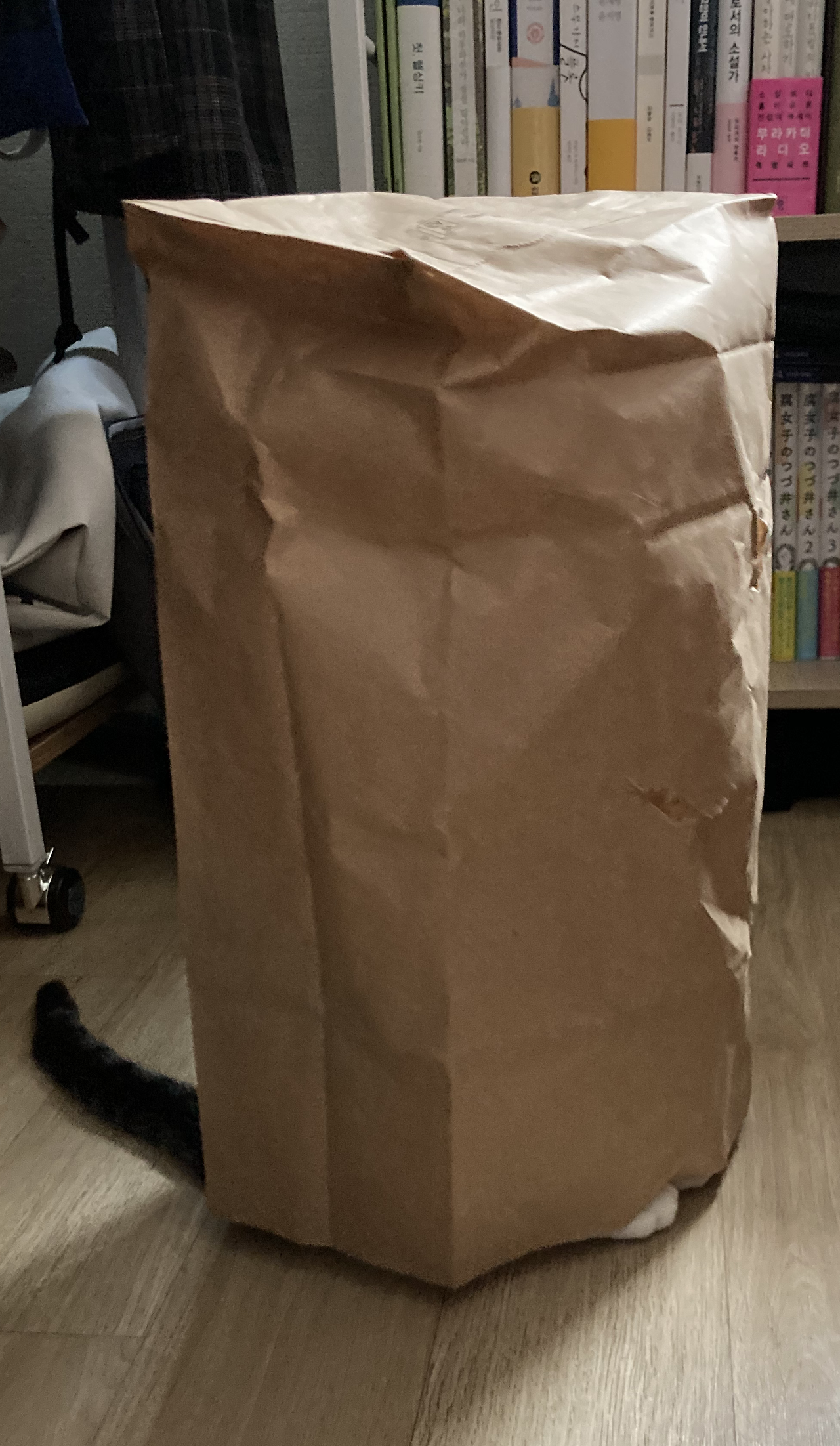또 다른 여명이 픽은 종이봉투다. 아무 봉투나 좋아하는 건 아니다. 자기 취향의 크기와 두께가 있어서 거기서 조금만 벗어나도 본체만체한다. 지금까지 본 중에 여명이의 취향을 가장 만족시킨 건, 내가 종종 배달을 시키는 샌드위치 전문점의 종이봉투다. 종이봉투만 던져주는 걸로는 끝나지 않는다. 적당히 구멍을 뚫어서 그 사이로 장난감 잡기 놀이를 할 수 있도록 만들어줘야 한다. 그리고 여명이가 질릴 때까지 종이봉투에 숨은 여명이를 찾는 시늉을 해줘야 한다. 적당히 하면 노여워하기 때문에 박진감 넘치지만 여명이가 놀라지 않는 선에서 찾는 시늉을 해줘야 한다.