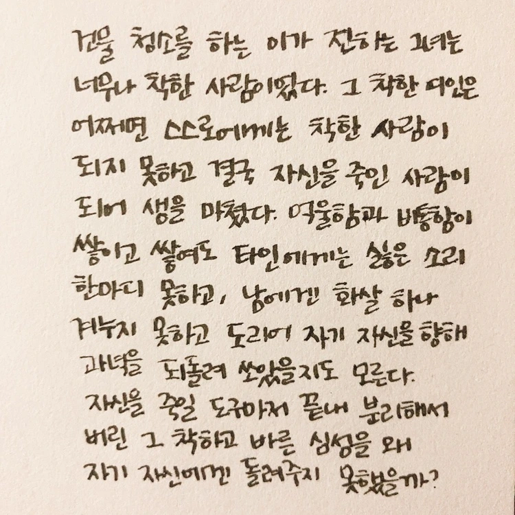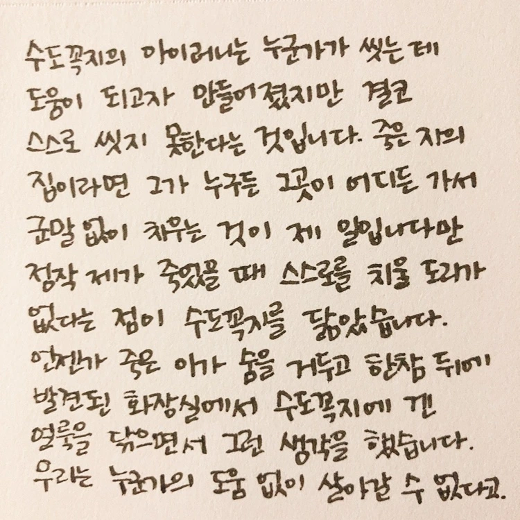 '잘해봐야 시체가 되겠지만'이 죽은 사람의 몸에 대한 이야기였다면, '죽은 자의 집 청소'는 제목에서 알 수 있듯 죽은 사람이 남기고 간 자리에 대한 이야기다. 읽는 내내 뭐라 짚어내기 어려운 마음이 들었다. 슬프기도, 안타깝기도 했고, 읽는 게 힘들 정도로 처참한 마음이 들 때도 있었다. 고독사 이후의 집에 대해 생각해본 적이 없었기 때문에, 그곳을 정리하고 치우는 사람이 있을 거라는 생각도 제대로 해본 적이 없다. 저절로 집이 깨끗해지는 게 아니니까 누군가는 했을 일인데도. 시종일관 담담하게 이야기를 하는 작가가 가끔씩 울컥하는 대목들이 있어서 그런 부분에서는 같이 울컥하기도 했다.