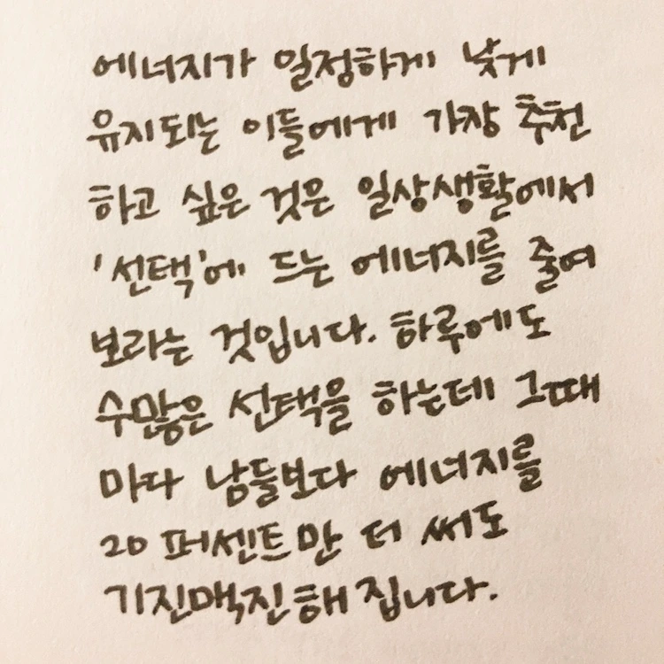 이건 예민한 데다가 우유부단하기까지 한 나에게 주는 직접적인 조언으로 느껴졌다. 물건을 하나 사야 하면 디자인이든 뭐든 최소 3일은 고민하는 나에게 그 에너지를 좀 줄여보라고 하는 것 같았다. 결국 선택에 필요한 고민도 에너지를 쓰게 되고, 에너지를 소진하면 사람은 지치고 예민하게 되니 그 고리를 끊어보라는 이야기였다.