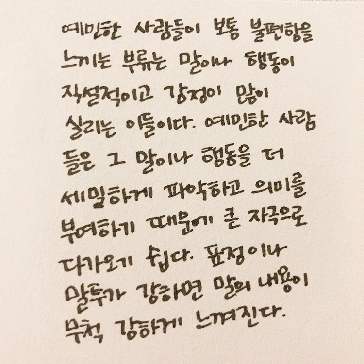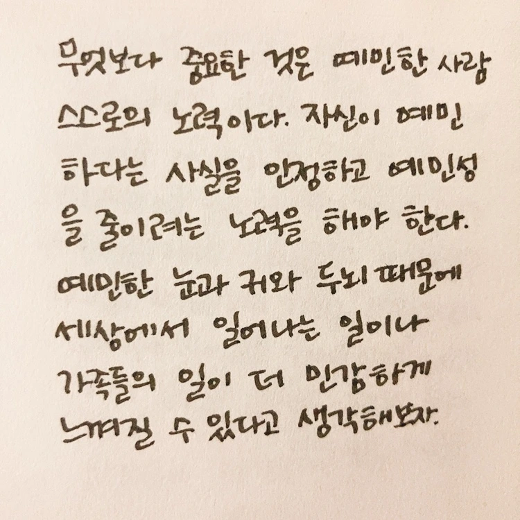 나는 예민한 편이다. 예민한 사람인 게 확실한데 굳이 '편'이라는 쿠션을 넣은 이유는 예민함의 기준이 상대적이고, 집 밖에서는 덜 예민한 사람이 되려고 노력하고 있기 때문이다. 집 밖에서 보내는 10시간 이상 내가 예민하지 않은 사람으로 살고 있다면 예민한 편이라고 해도 되는 게 아닌가 싶었다. 예민함은 그 사람이 가진 기질일 뿐 마음먹기에 따라 장점이 될 수도 단점이 될 수도 있다. 그런데도 나는 예민함이 온전히 단점인 것처럼 다른 사람에게 내가 예민하다는 걸 말하기가 어렵다. '나 예민해요'라는 말속에는, 그러니까 내가 어지간히 마음에 안 들게 굴어도 상대방이 이해해야 한다는 뜻이 슬쩍 들어있는 것 같아서다. 나는 정말 예민한 사람인가, 어느 정도로 예민한 사람인가, 예민한 사람으로 살면 어떻게 되는가. 여러 의문들을 가지고 나는 이 책을 읽기 시작했다.
