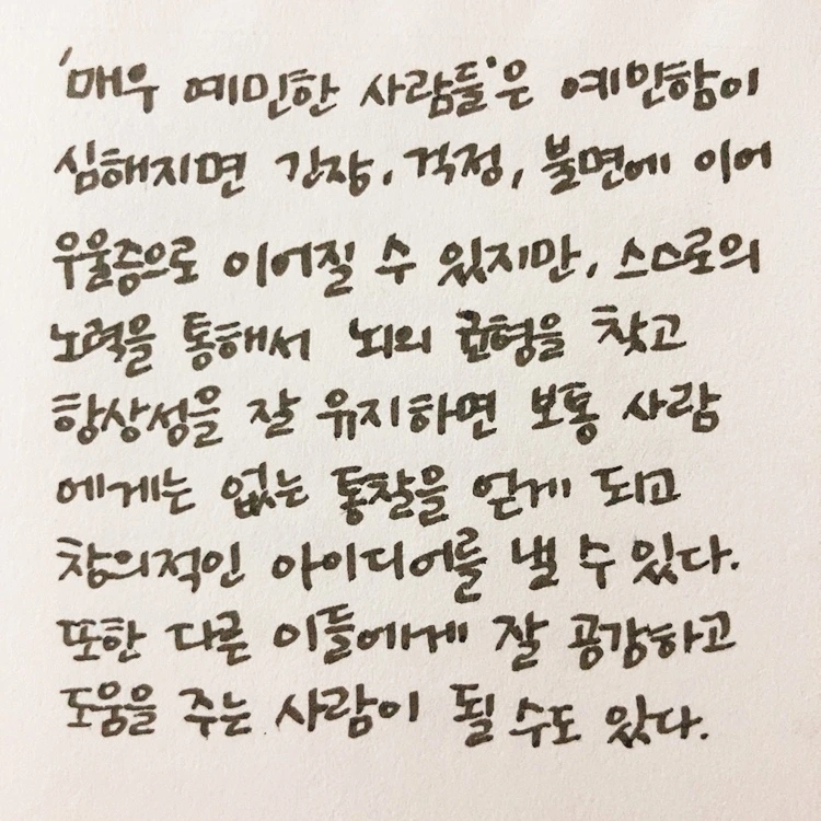 예민함을 극복하거나 강점으로 활용한 유명인들의 이야기부터 일반인의 상담 사례까지 다양한 이야기들이 있었다. 너무 큰 과업을 달성한 유명인들의 이야기들보다 일반인들의 이야기가 나에게는 좀 더 현실적으로 느껴졌다. 유명인들 중에서는 처칠이 자신의 우울증을 어떻게 다루었는지에 대한 이야기가 흥미로웠다. 내가 먼저 내가 예민하다는 걸 인정하는 일이 생각보다 중요하다는 생각이 들었다.